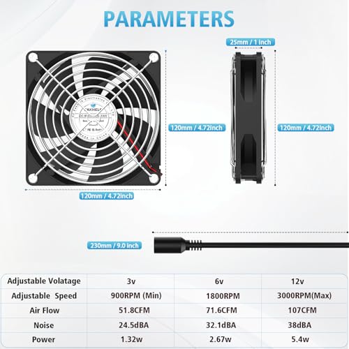 ?Wide application?this cooling fan proves invaluable when your electronic equipment or confined spaces begin to overheat. Effectively cooling down devices and facilitating air exchange, it efficiently circulates air to keep your electronic equipment and other compact areas, such as spaces for animal and plant growth, at optimal temperatures. Whether it's your Xbox, PS4, sound system, amplifier, radio, receiver, audio equipment, server, refrigerator, internet gateway, computer case, vintage sink closet, dried meat box, DIY humidifier, or any other device or space in need of cooling or improved air circulation, this cooling fan provides a reliable solution... ?Bearing Option&Working Life?The 120x120x25mm/4.71"x4.71"x1" cooling fan offers a choice of bearings, with a durable double ball bearing and a pure copper coil motor ensuring smooth operation and extended lifespan. Designed for reliability, these fans boast an operational lifespan of up to 50,000 hours. Additionally, their versatile design allows for both vertical and horizontal installation configurations. ?Safe to operate?Featuring double-sided metal fan grilles, this unit ensures operational safety by effectively shielding both hands and fan blades from accidental contact. During operation, aligning the 180° directional air outlets parallel to electronic equipment or confined spaces allows optimal airflow. This configuration effectively dissipates heat from electronic devices or vents' surfaces, ensuring sufficient airflow to maintain optimal temperature levels within the designated area. ?Variable Speed & Air Flow?These cooling fans' variable speed and airflow capabilities, controlled via an AC plug speed controller, offer versatility to optimize performance according to specific preferences. Operating at 100% speed ensures maximum airflow while reducing speed to 30% maintains an acceptable noise level. With a speed range from 900RPM to 3000RPM, adjustment is easily achieved by manipulating the Stepless controller, varying voltage output from 3V to 12V. Additionally, convenient ON/OFF functionality is provided through a dedicated switch on the controller. ?Warranty&Technical support?Our warranty, except for non-human damages, is for one year, during which customers are entitled to receive a replacement unit. Furthermore, we offer lifetime technical support and comprehensive after-sales service. Should you have any inquiries or concerns, please do not hesitate to contact us.