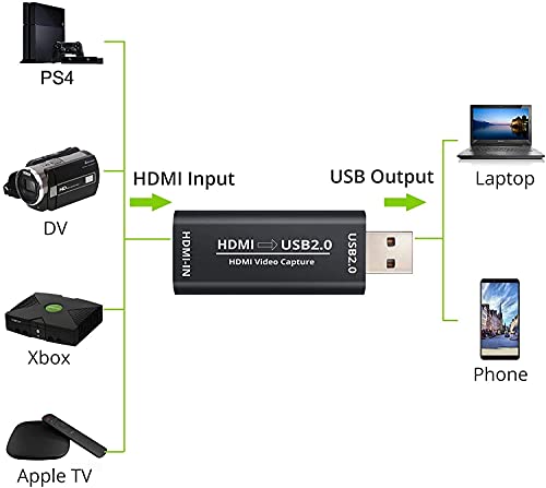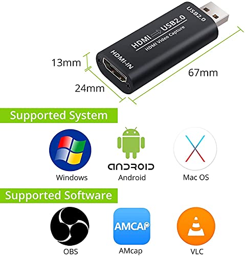 HDMI VIDEO CAPTURE : HDMI capture card can record high-quality images on PC. It supports UVC (USB Video Class), you can easily record PC game video by simply connecting between PC and game console. Using our "Video Capture Card", you can easily achieve HDMI pass-through and PC recording, and you can use the built-in functions of existing software to achieve a seamless experience. HDMI VIDEO CAPTURE : HDMI capture card can record high-quality images on PC. It supports UVC (USB Video Class), you can easily record PC game video by simply connecting between PC and game console. Using our "Video Capture Card", you can easily achieve HDMI pass-through and PC recording, and you can use the built-in functions of existing software to achieve a seamless experience. HDR RESOLUTION : In order to ensure that reliable video and streaming media will not crash and provide a high-quality user experience, the game capture card adopts a USB 2.0 interface, without CPU intervention, and can record at a high quality of 1080p/30fps. Maximum input resolution: 3840x2160 @ 30Hz, maximum output/recording resolution: 1920x1080 @ 30Hz, 1280x720P @ 60Hz. WIDE COMPATIBILITY : HDMI game capture card can be connected and used with most console devices (such as mobile phones, consumer games, consoles, switches and cameras). You can display the video/audio of PS.4, X/.box, Nin-tendo Switch or other home game consoles on your PC and record/live broadcast (live broadcast). Now you can post real-time game videos to video distribution sites such as YouTube, Facebook and Twitter. PLUG AND PLAY : Compact design, no need to install power supply or drive, and easy to carry. You don't have to prepare a new environment, you can implement it in the current Internet environment. You can use a conversion cable that supports HDMI input to connect to a variety of devices. Through the easy-to-understand operation screen, you can easily record game videos.