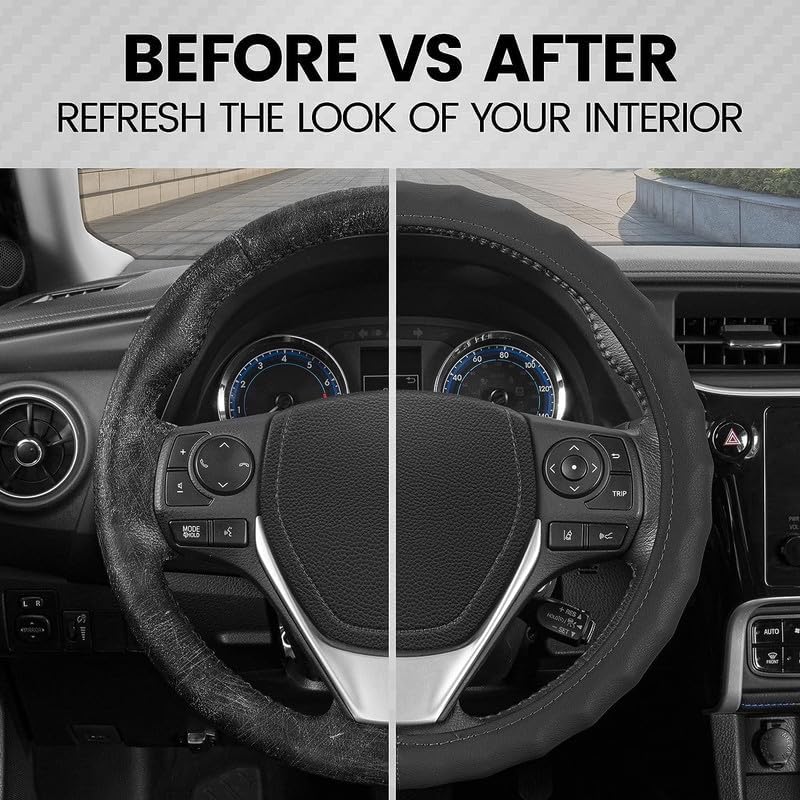 Steering wheel cover is made of Faux PU leather made for strength and durability. The Material of the cover is very soft like feather what makes your hands feel good. This Steering Wheel Cover is not hard to Install. One Can easily cover up his Car's steering wheel with this cover. Steering wheel protector doesn't only protect the original looks of your car steering wheel, but also improves the looks of your car interior.