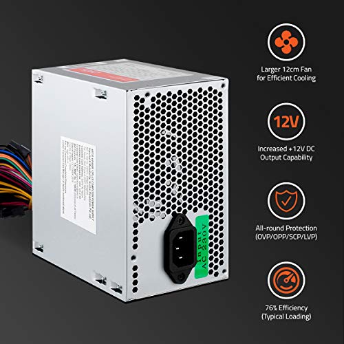 Larger 12cm Fan for efficient cooling Supports the latest ATX 12V Intel & AMD Platforms Smart Fan Control makes it super silent All – Round Protection: OVP (Over Voltage Protection) UVP (Under Voltage Protection) OPP (Over Power Protection) SCP (Short Circuit Protection) Keeps noise levels under 22dBA High efficiency :> 75% 100% Tested for: Hi-Port Chroma, Burn-in Function, Vibration Levels & Leakage current Support SATA Peripherals Input Voltage Range: 170- 270V Input Frequency: 50 -60 Hz Increased + 12V DC Output Capability SATA HDD X 3, IDE HDDX 1 , 20+4 PIN X1 , 12V P4
