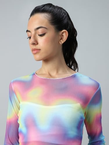 Bewakoof Women's Cotton Air 1.0 Tie & Dye Slim Fit Full Sleeve Round Neck Poly Mesh Short Top