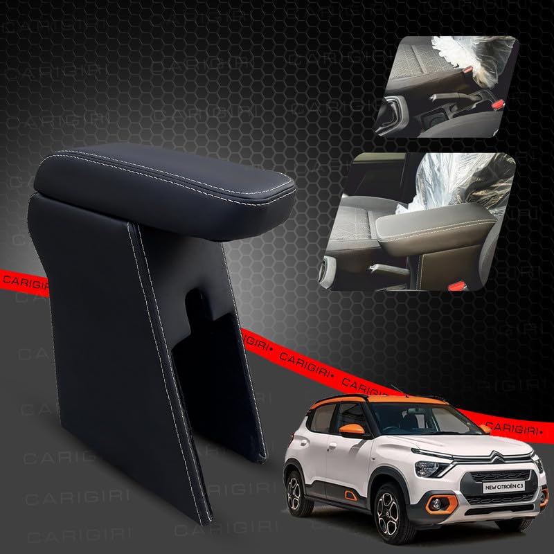 Carigiri Premium Finish Car Armrest with Storage Box And High Density Moulded Foam For Citroen C3/ eC3 (Black With White Double Stitching,Nappa Leatherette)(No Obstruction to Rear Window Buttons)