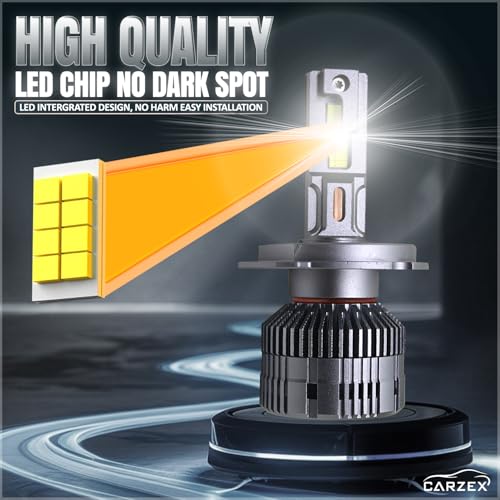 NOTE: ? Please refer to the product images for your vehicle’s bulb size compatibility chart. Do NOT purchase before confirming your car's bulb size. High-Power CSP LED Chips: ? Designed with advanced CSP LED technology, these H4 LED headlight bulbs are up to 500% brighter than stock halogen bulbs. They deliver focused beam patterns with wider and farther lighting range, ensuring clearer visibility and safer night driving EASY PLUG & PLAY INSTALLATION: ? Features a compact 0.72-inch low-profile design that fits 95% of vehicles. The all-in-one design requires no modifications—simply plug in and install within 15 minutes for quick and hassle-free setup. SUPERIOR HEAT DISSIPATION: ? Built with a high-speed silent cooling fan operating at 10,000 RPM to keep the bulbs cool during use. The die-cast aluminum body ensures efficient and rapid heat dissipation, enhancing performance and extending bulb lifespan. IMPORTANT NOTE: ? H4 LED bulbs are compatible only with vehicles that support H4 3-pin sockets. These will not fit in 2-pin sockets. Please verify your vehicle’s bulb type via the car manual, service provider, or bulb size chart before purchase. Professional installation is recommended, as some tools and skills may be required.