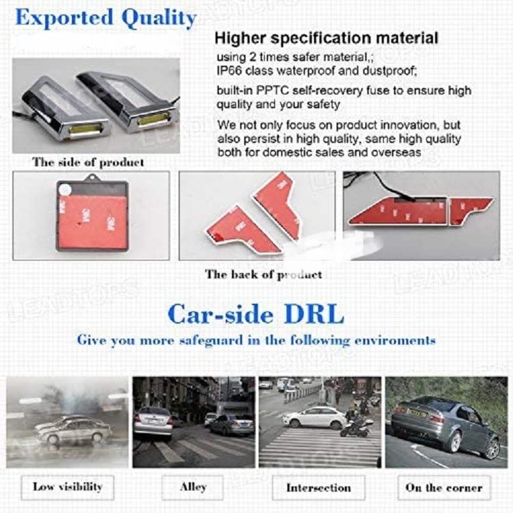 Installed next to the car side and it attracts attention best suited for all cars. When reversing at night see both sides and it can reduce the damage to the car It operates three function Reverse light,Turn signal light,Daytime running light(DRL). While in the reverse gear the back-up lamp and rear lamp will flash simultaneously ,which able to illuminate car side and intimate the other running cars. DRL turns on when car starts. When turn signal lamp lighting up the daytime lamp turns off and at the same time changing to flashing amber,which indicating car's location and situation.