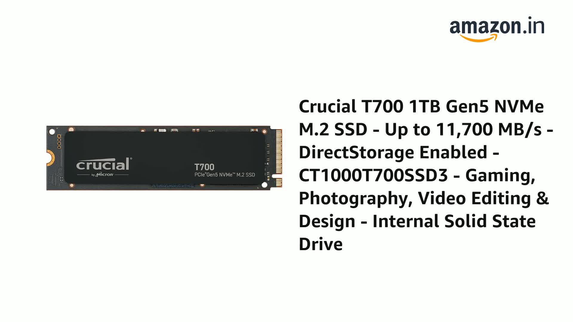 Crucial T700 1TB Gen5 NVMe M.2 SSD - Up to 11,700 MB/s - DirectStorage Enabled - CT1000T700SSD3 - Gaming, Photography, Video Editing & Design - Internal Solid State Drive