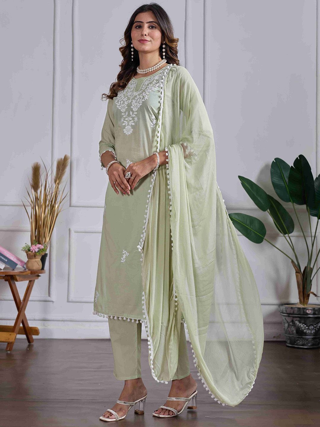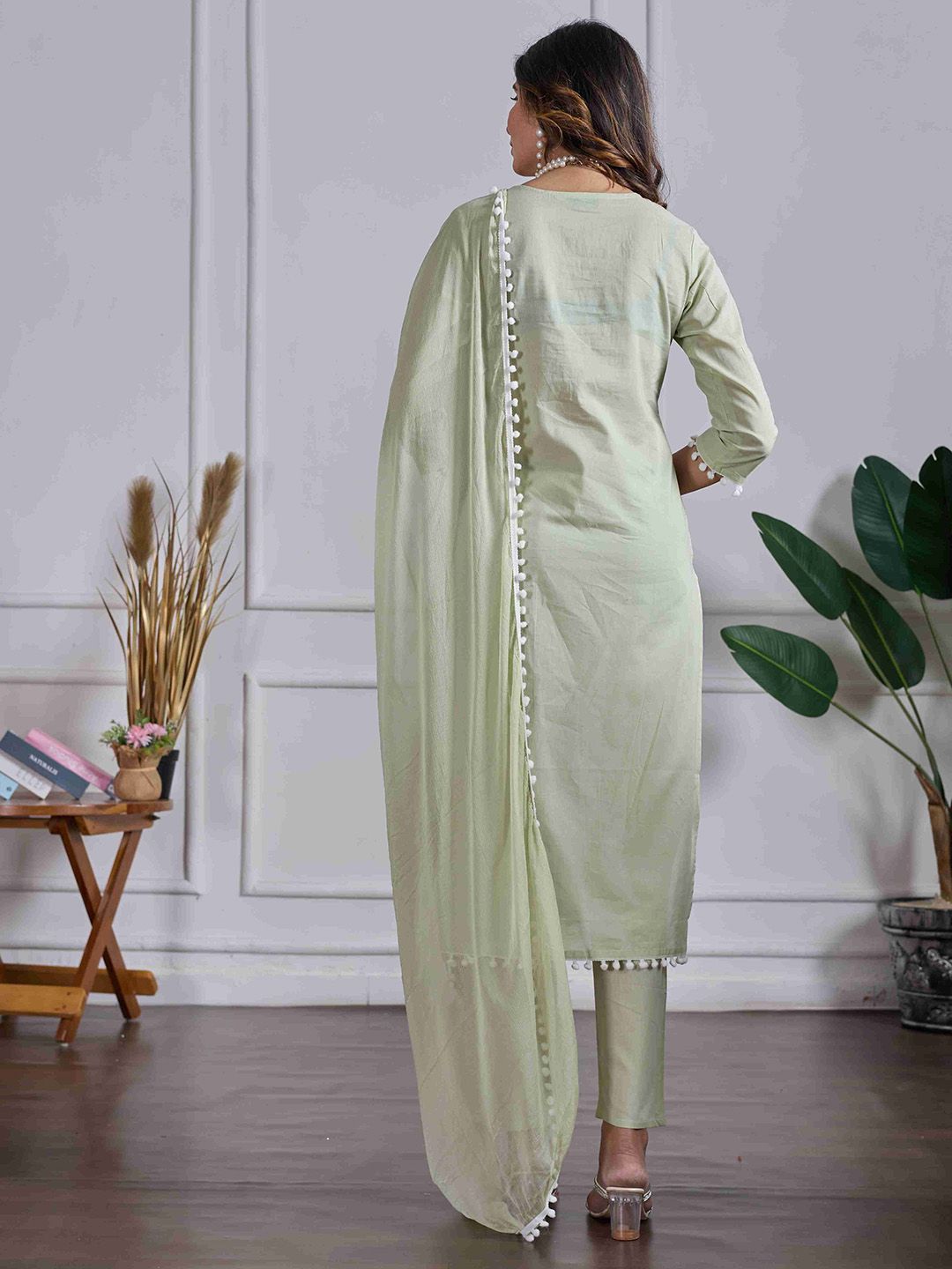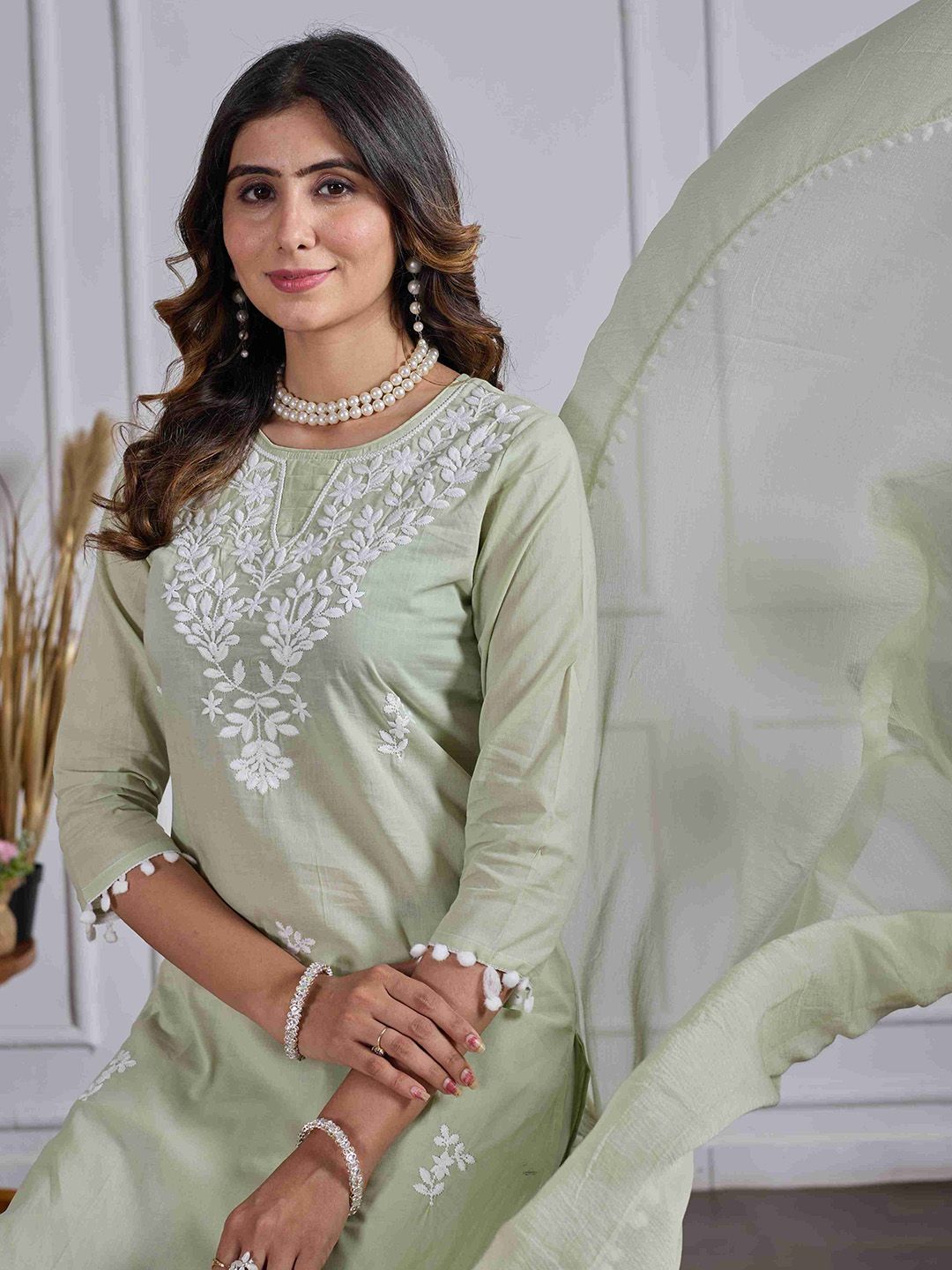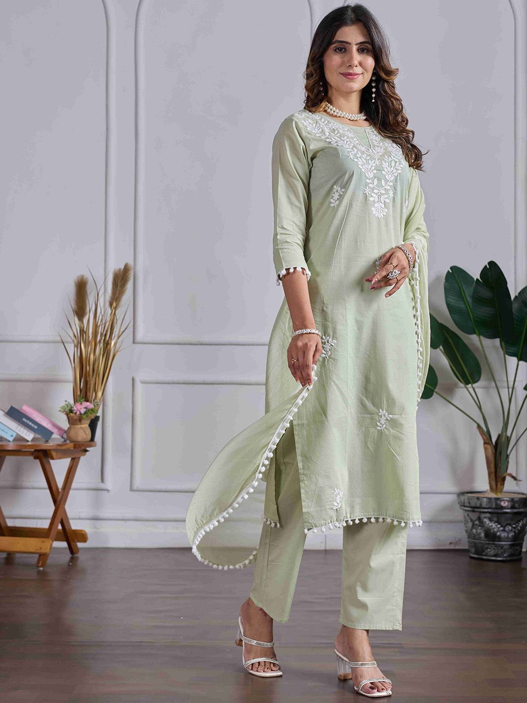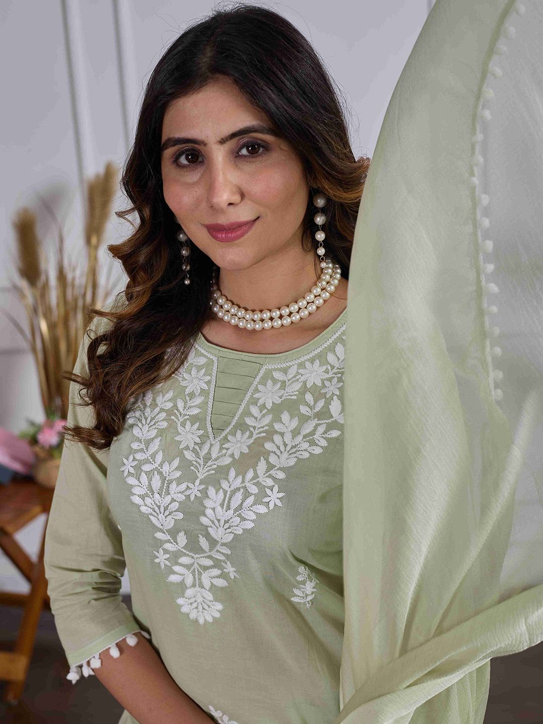 DRUPH & CO Paisley Embroidered Chikankari Pure Cotton Kurta With Trousers & Dupatta
