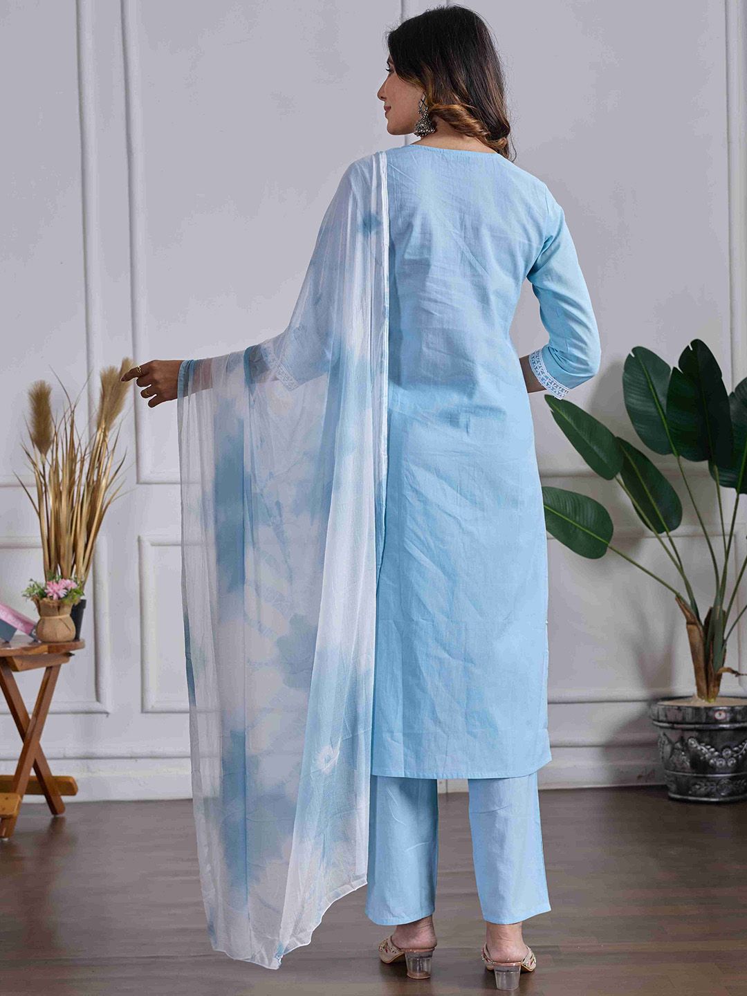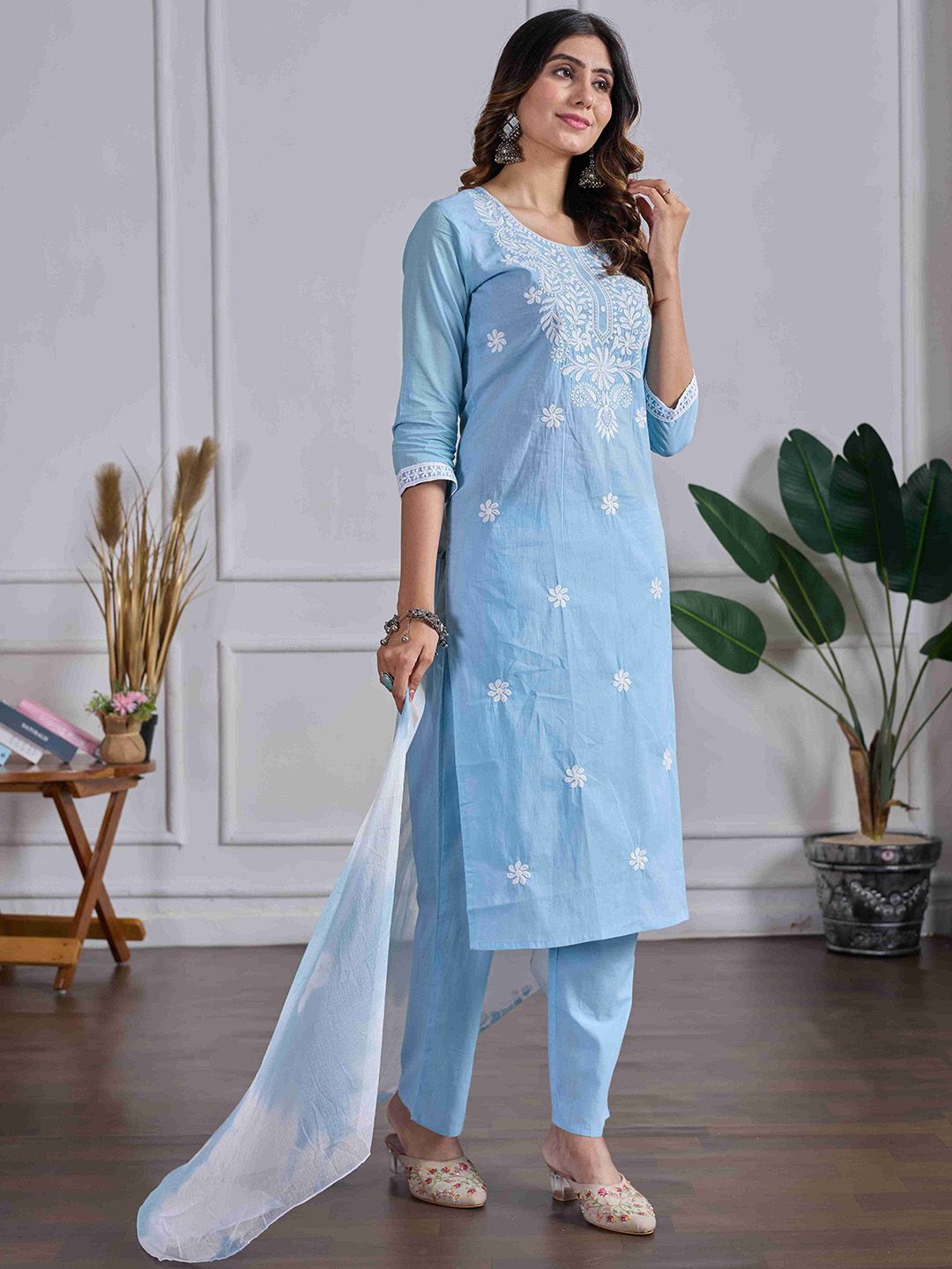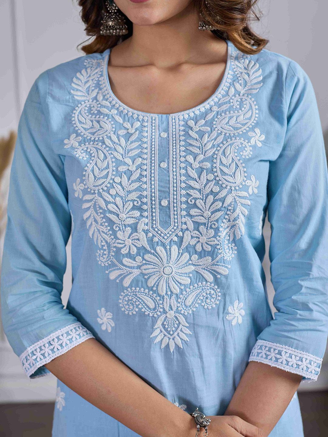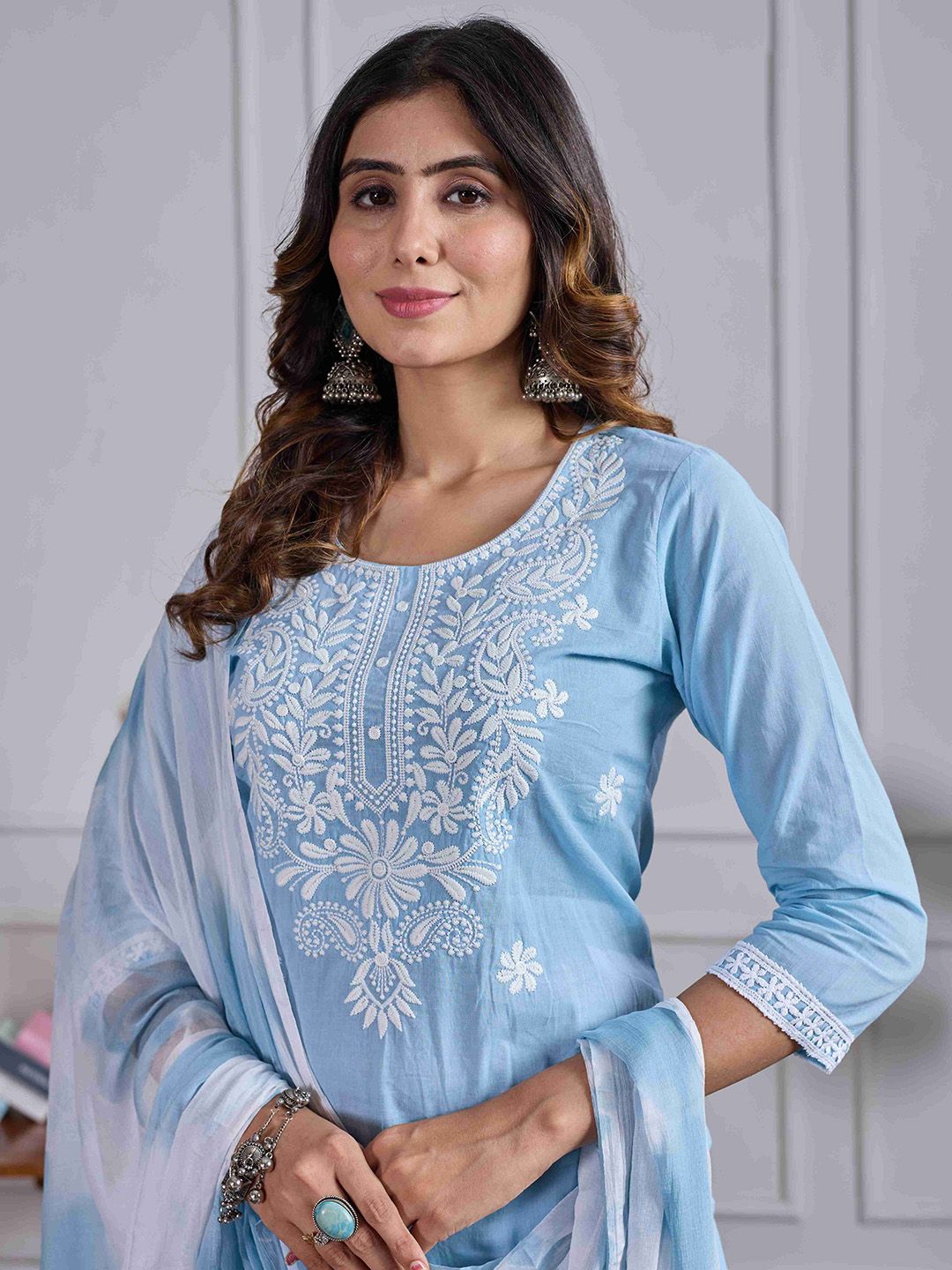 DRUPH & CO Paisley Embroidered Chikankari Pure Cotton Kurta With Trousers & Dupatta