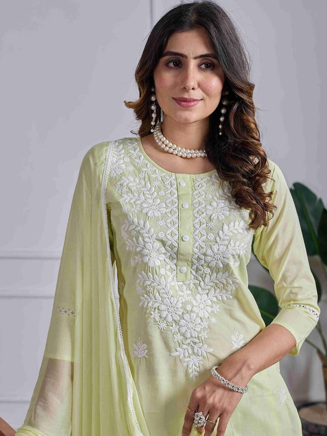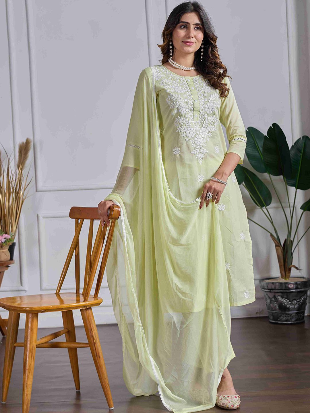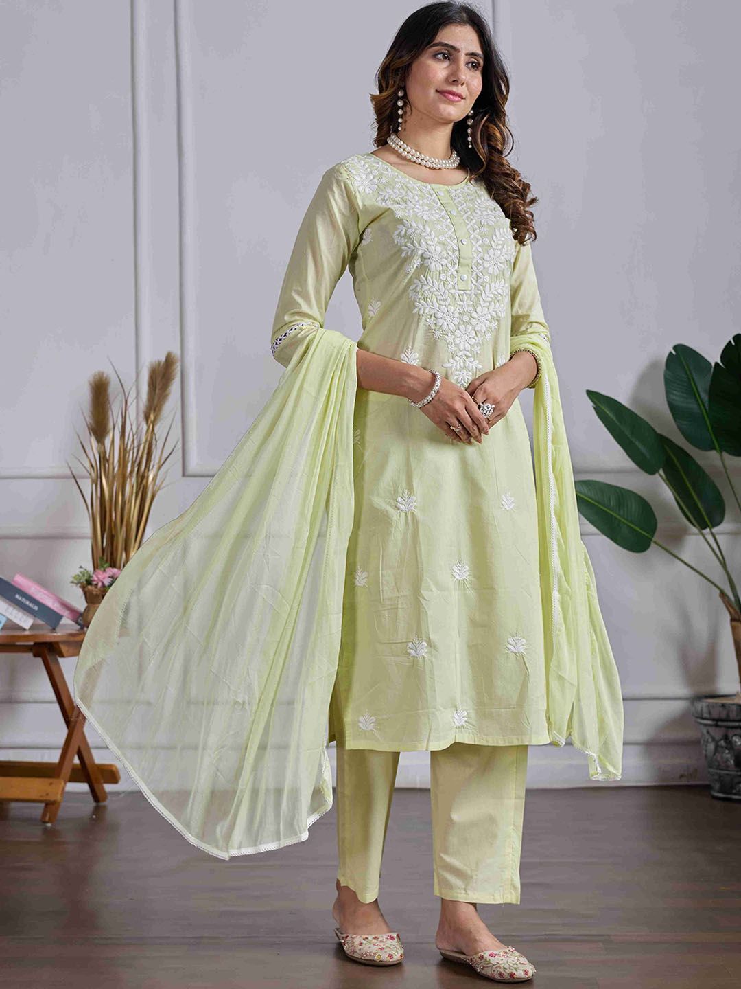 DRUPH & CO Women Floral Embroidered Chikankari Pure Cotton Kurta with Trousers & Dupatta