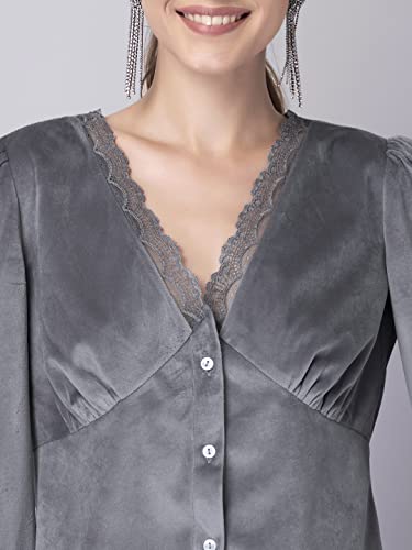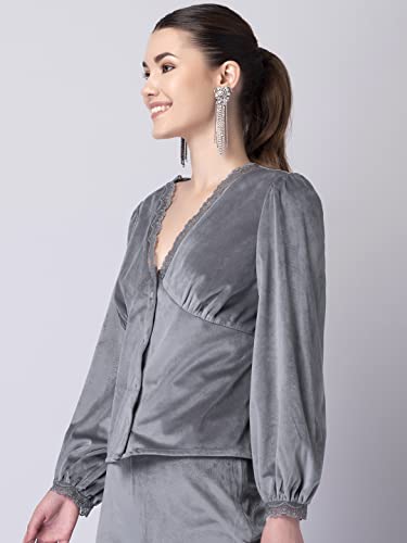 FabAlley Women's Polyester Regular Fit Grey Velvet Lace Trim Buttoned Blouse