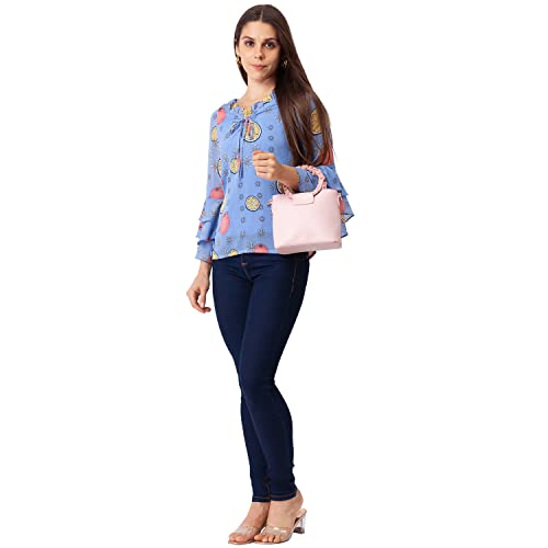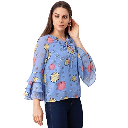 Globus Women Blue Floral Print Tie-Up Neck Ruffles Top