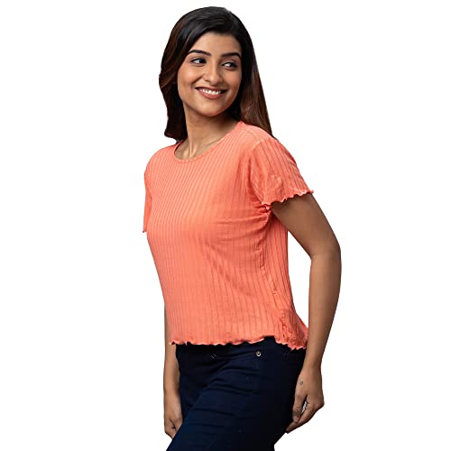 Globus Women Coral Solid Round Neck Casual Regular Fit Crop Tshirt