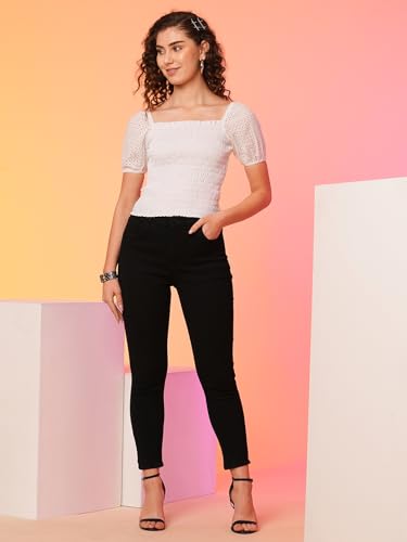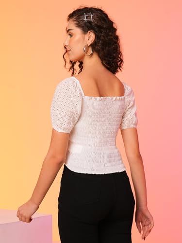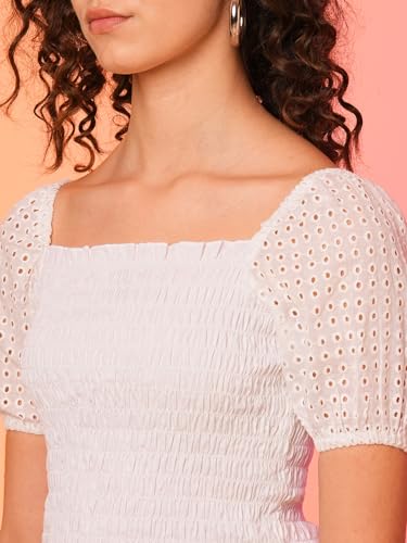 Globus Women White Square Neck Smocked Cotton Schiffli Crop Top