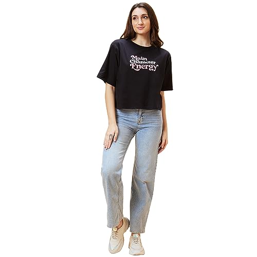 Globus Women's Cotton Typography Print Round Neck Boxy Fit Casual Crop T-Shirt