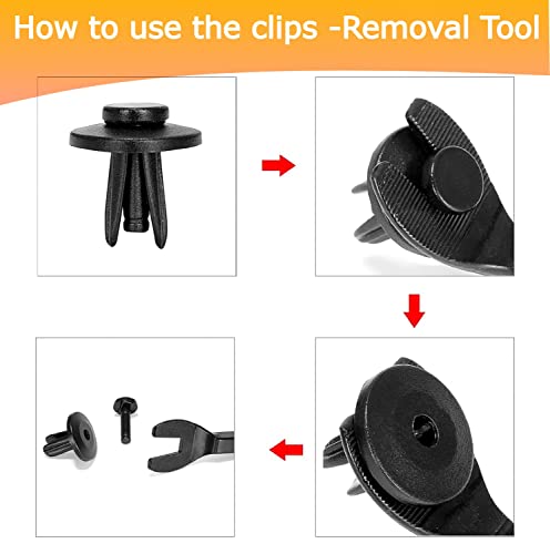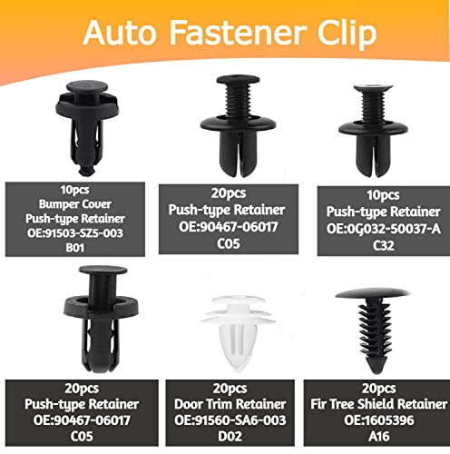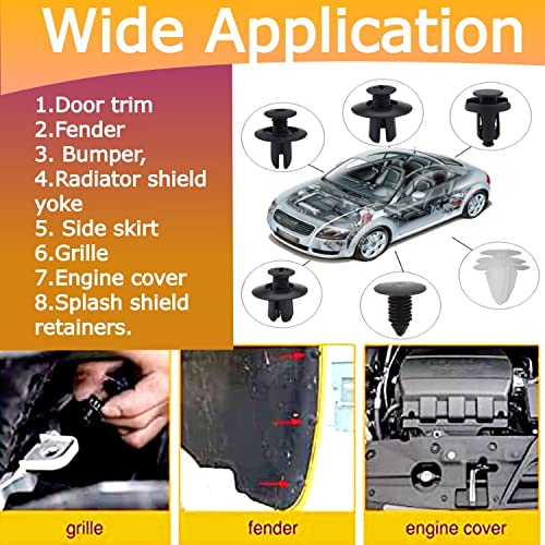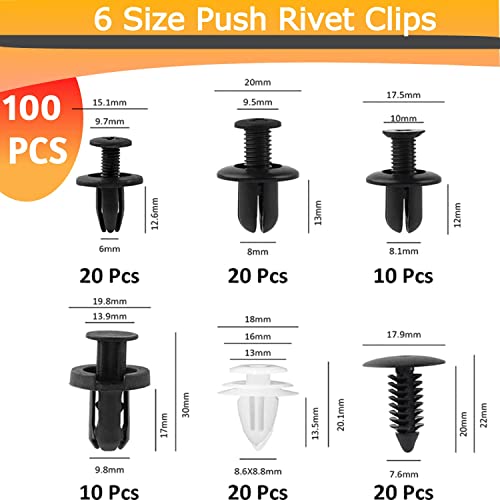 car bumper clips ; This Car Panel Removal Tools are made of high-quality black nylon material, which has anti-wear and anti-corrosion effects. Package includes ; 6 Size Auto Fastener Clip 100 pcs Car Door Plastic Trim Panel bumper Clip car door plastic panel clip features : Car Auto Retainer Rivet fastener allows you to quickly and easily remove door panels and Car clips without damaging them for easy access to tight areas. fastener clips for car : The car clips and fasteners are ideal for motor vehicles like car, auto, domestic appliances, furniture, and electrical equipment, used as Car Clips panel clips, door trim clips, door panel clips, bumper clips, fender clips, engine cover, splash shield retainers, and other interior accessories replacement, etc. car push retainer clips - Don not worry about lost or damaged body fasteners. All the necessary retainers for exact replacement of old and broken retainer. car door clips push type : Our Auto Door Car panel Clips set body panels adopts ergonomic design with super lightweight easy handheld features which effectively effort saving for various interior and exterior car in the shortest time
