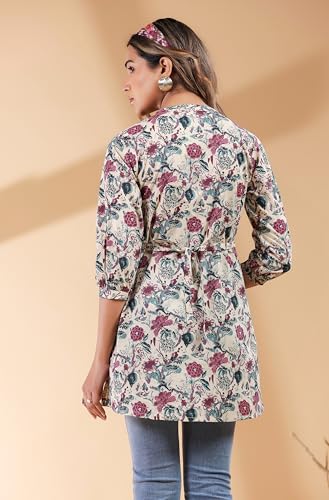 Janasya Women's Beige Pure Cotton Floral Printed Straight Tunic