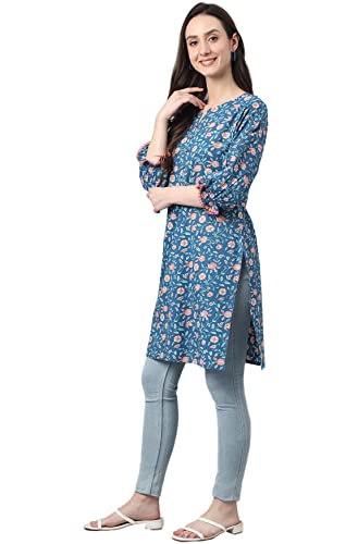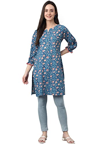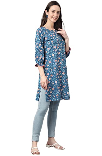 Janasya Women's Blue Cotton Floral Print Regular Tunic