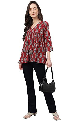 Janasya Women's Maroon Pure Cotton Floral Block Print Flared Top