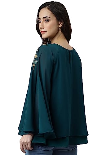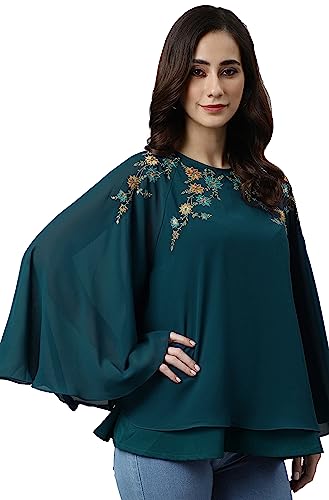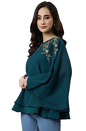 Janasya Women's Teal Blue Georgette Embellished A-Line Top