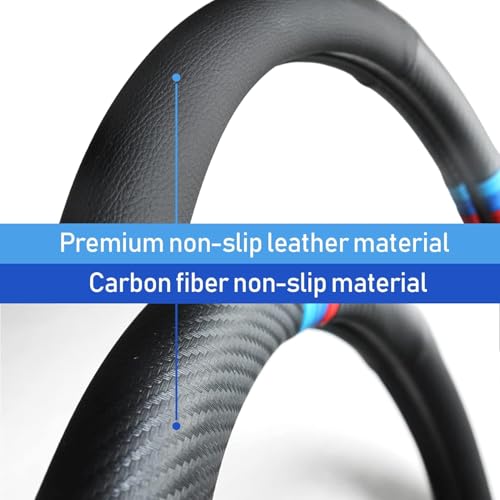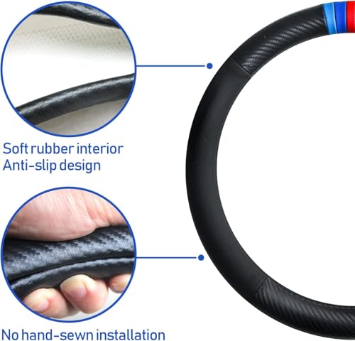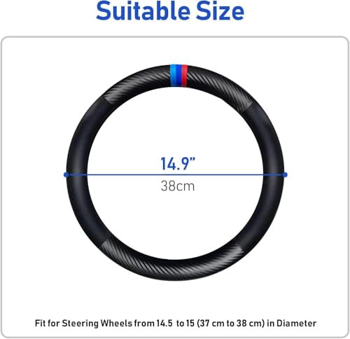?Premium Material?Made of excellent carbon fiber and superfine fiber PU leather, it is durable, comfortable and breathable. The appearance is full of sporty and fashionable sense, and it is both beautiful and practical. ?Safety Assurance?Protect the steering wheel to the utmost extent and reduce wear and tear; the interior is made of high- quality rubber, which has strong grip and makes the steering wheel more stable; the embossing on the exterior enhances the anti-skid performance and ensures the safety of driving. ?Good Comfort?This steering wheel cover has excellent heat insulation and heat insulation performance, which brings customers comfortable use and driving experience; high-tech precision machine production, so that the texture of the steering wheel cover is more ergonomic. ?Wide Applicability?This Steering Wheel Cover is well compatible with 98% of vehicles, Suitable for middle-size steering wheels with diameter 37cm to 38cm. ?Installation Simple?Just cover it on the top of the steering wheel and hold the top of the cover with both hands on both sides gradually down and tighten.