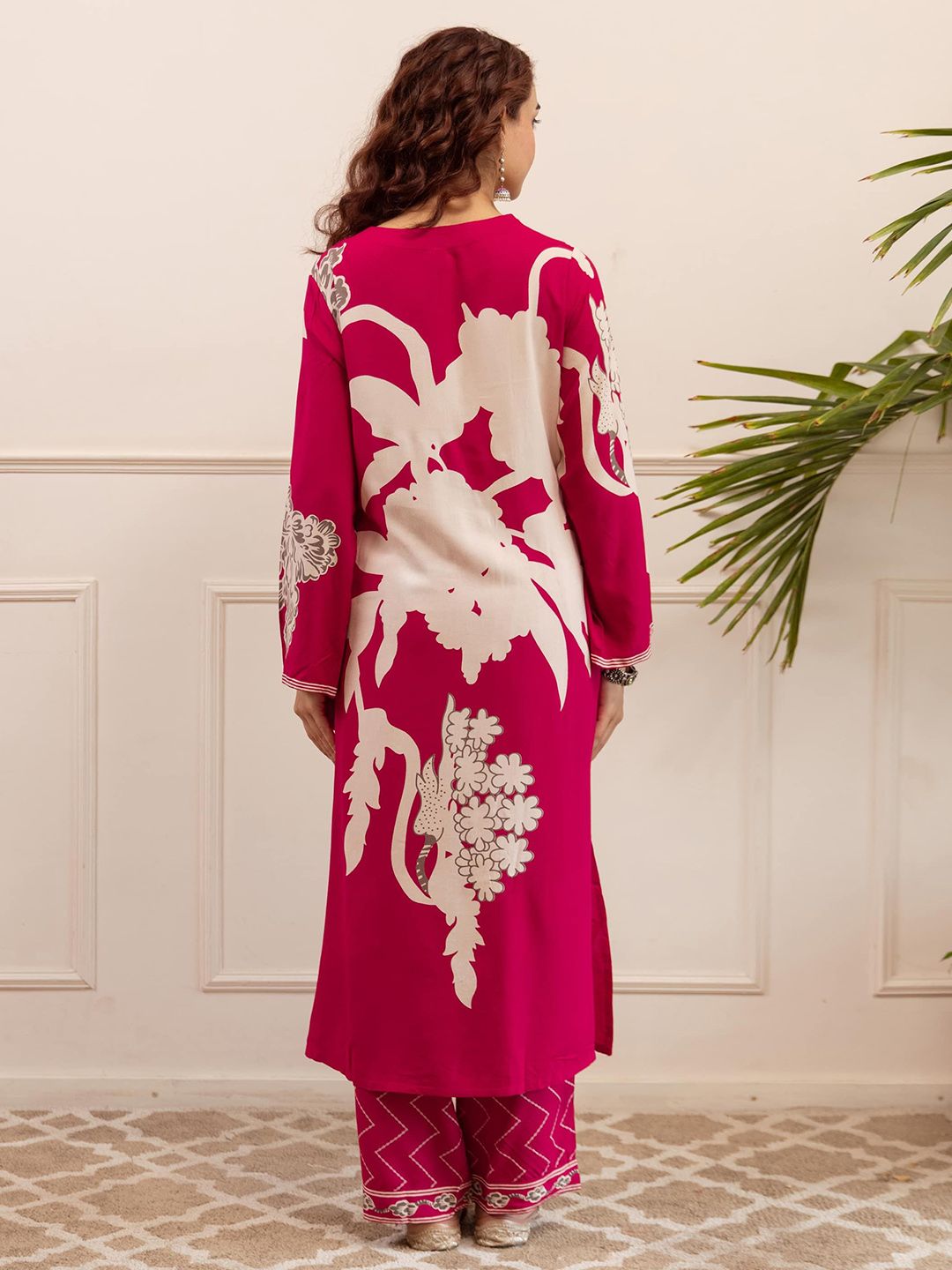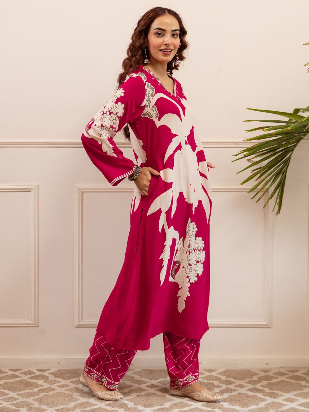 KALINI Floral Printed V-Neck Straight Beads and Stones Kurta With Palazzos