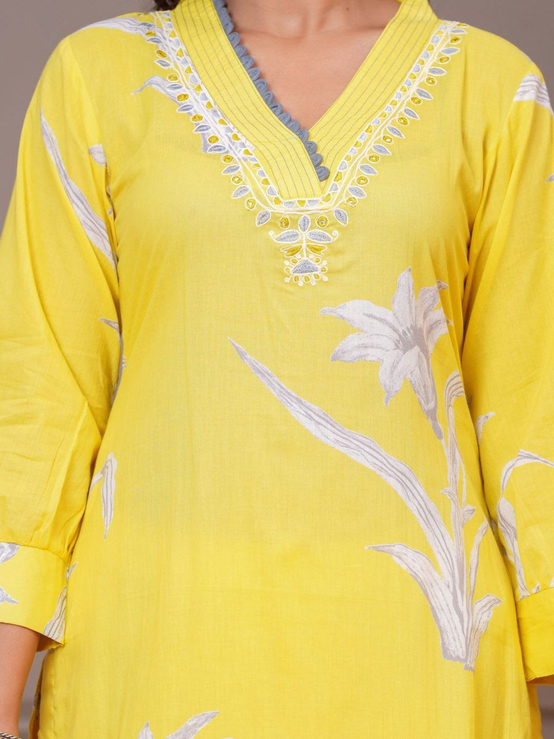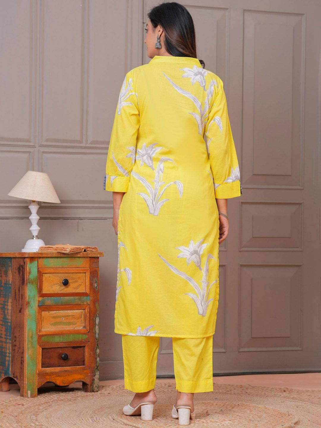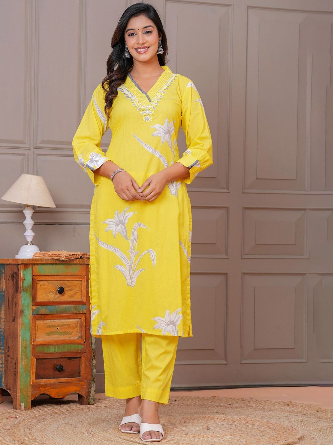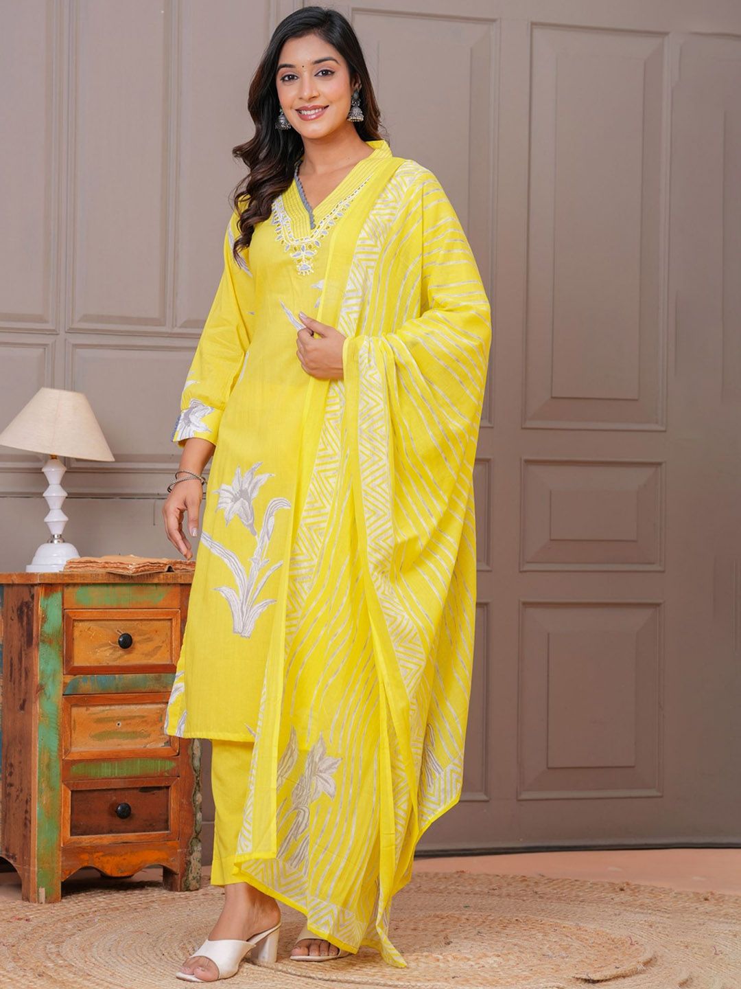 KALINI Women Floral Yoke Design Cotton Kurta with Trousers & Dupatta