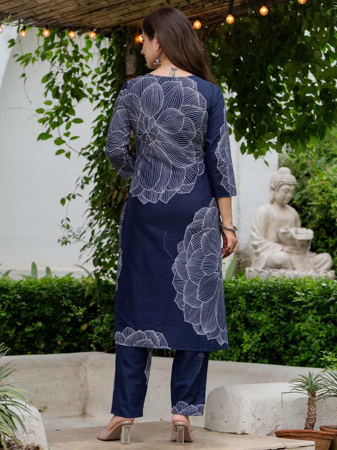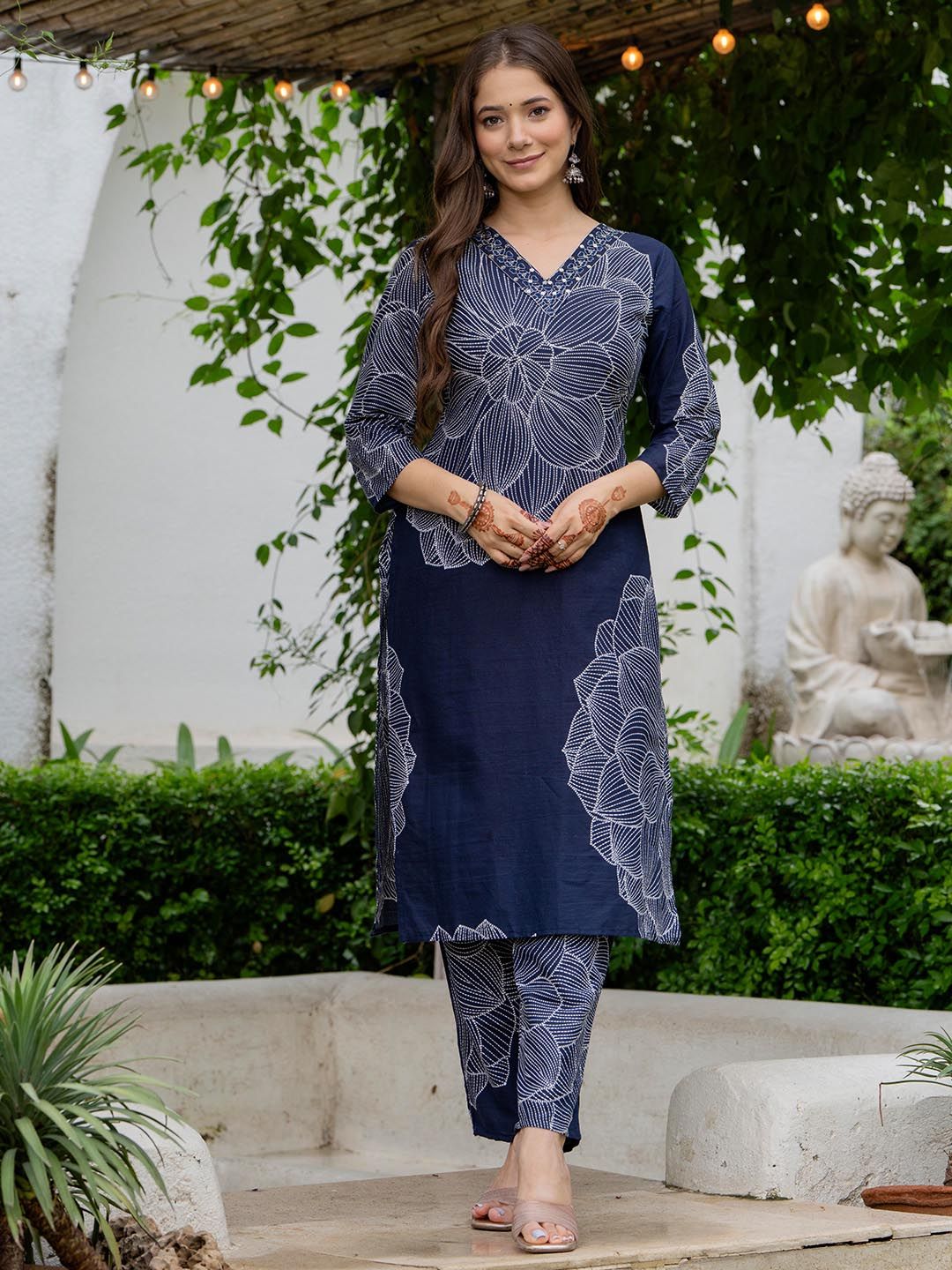KJFAB Women Blue & White Floral Printed Cotton Kurta with Palazzos