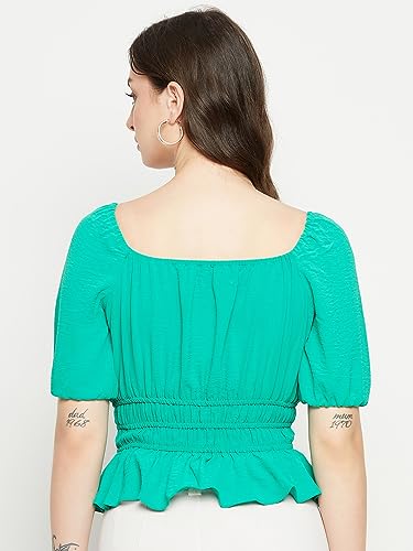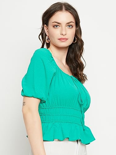 Madame Tie-Up Square Neck Solid Green Textile Top for Women