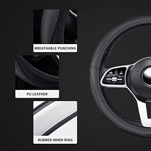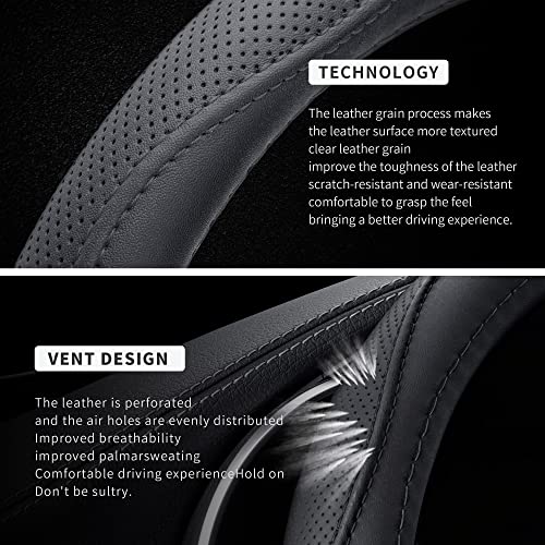 This durable and easy-to-install steering wheel cover is the premier option for covering any old or worn original factory steering wheel. The fine and supple microfiber leather is much softer than factory-installed steering wheel. It provides a comfortable touch when driving, helps reduce driving fatigue, and brings you a pleasant driving experience. Constructed from non-slippery microfiber leather exterior and rubber lining, this car wheel cover adds secured safety performance when driving. It also protects your steering wheel from sunburn, scratches, fading, wear, and dirt Suitable for all mid-size steering wheels with outer diameter 14-1/2 inch to 15 inch (37cm to 39cm). Easy to Install,Because of the ductility material, Any adult can easy install this steering wheel cover, no tools required.Tips: It is not fit F-150 Tundra Tacoma Range Rover Prius 2006-2015 Civic.Please carefully measure the size of your steering wheel before purchasing.