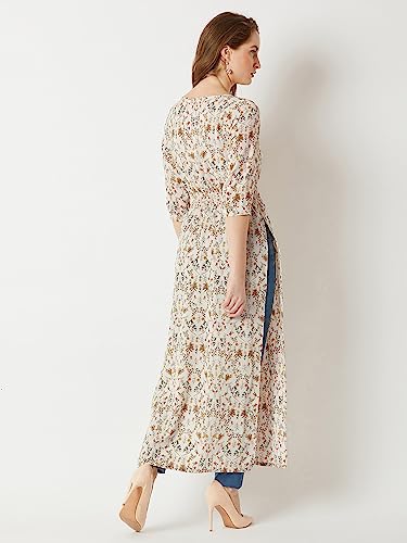 Miss Chase Women's Round Neck 3/4 Sleeve Floral Tie Up Tassel Detailing Front Slit Maxi Top