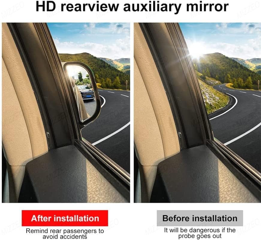 ??MORE SAFETY?: The rear-view side mirror increase safety for back seat passenger by eliminating blind spots when getting off. Wide angle mirror is genius gift for kids and elderly. This side view mirrors make behind passengers see their blind spot so much better, it makes a huge difference. ??CLEAR CONVEX MIRROR? - This Clear Convex Rear-view Mirror to help prevent accidents caused by sudden opening of rear doors, and give rear seat passengers ultra-clear images. This side view mirror stick on the B pillar, fits most car and SUV. Please make sure the B-Pillar size (width >2.2in) before purchasing. ??DURABLE FRAME?High impact ABS housing frame holds the mirror tightly. This B-Pillar blind spot mirror doesn't foldable, stick on the vehicle by 3M-taped strongly. Before installation, first please confirm whic is the left and right mirror, then confirm the mounting area with the best angle. ??EASY INSTALLTION?The side view mirror with simple design makes the rear-view mirror easy to install and remove. It's best to ask someone to help you find the best angle when installing the car mirror and make sure that the mounting area is no grease, no dust and no water. ??WARM NOTES?: 1. This is a pair of car mirrors, but left/ right and up/ down need to be distinguished; 2. Please install it on the B-pillar of the car rear door, but don't on the A-pillar of the front door. 3. Make sure the installation steps are totally right, otherwise the car blind spot mirror may fall.