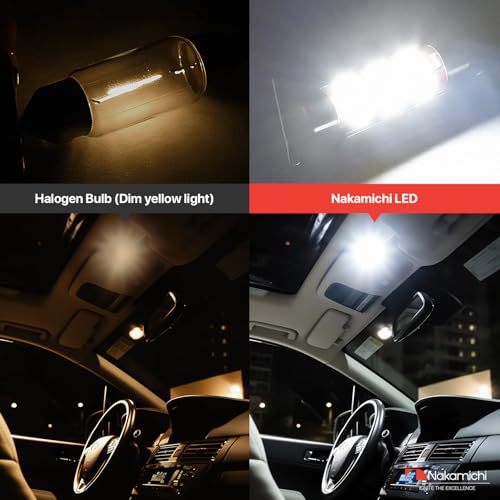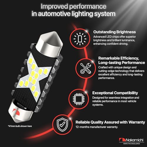 ? Nakamichi Corporation Ltd. founded in 1948 by Mr. Etsuro Nakamichi, is a Japanese consumer electronics brand that originated in Japan and gained popularity from 1970s onwards from producing high quality audio cassette decks to design-oriented home cinema audio systems, speakers, hi-fi systems, automotive stereo products and now extending their commitment to excellence in automative interior & exterior LED lighting. ? Achieve 200% more illumination than halogen: Experience a remarkable luminosity of up to 1,680 lumens and 2.4W per bulb with Nakamichi's enhanced festoon (28mm, 31mm, 36mm, 39mm, 41mm, C5W) LED bulbs. Sporting a 6000K xenon white colour temperature and boasting 12 high-performance SMD chips per bulb, they generate a brilliantly white, daylight-resembling beam, dramatically enhancing your nighttime visibility. Allowing you to view objects clearer during nighttime journeys. Also, with instant start-up, they achieve full brightness without any delay and looks cool indeed. ? 50,000 Hours of lifespan with state-of-the-art cooling mechanism: With heavy duty cold forging heat sink, a complete aviation grade 6063 aluminium body and a hollow body design, the Nakamichi LED bulbs guarantee an uninterrupted lighting for over 50,000 hours. Each LED bulb and its components undergo rigorous testing to ensure long lasting performance. This exceptional built ensures reliable performance even on hot sunny days or in adverse weather conditions. ? 1:1 Beam pattern and 360-degree illumination for effective lighting: LED light bulb quality extends beyond mere brightness. It's about having the right construction and LED chips that closely emulate the characteristics and fitting of halogen bulbs. These led bulbs can be used for car interior lights, dome lights, map lights, vanity mirror lights or cargo area lights, license plate lights, side door courtesy lights, scuff plate lights and many more. Please check the original bulb size before making your purchase. ? 95% Vehicle compatibility: Enjoy a seamless experience with Nakamichi LED bulbs. There is no radio interference, no flickering and no error codes. Nakamichi intelligent CAN-bus controller, makes it compatible with 95% of vehicle systems. However, for certain sensitive vehicles, the use of a load resistors or flash relay may be necessary to ensure optimal performance. ? Effortless 10-minute installation: Featuring a nearly identical design resembling traditional halogen light bulbs and a non-polarity socket, our LED bulbs seamlessly fit into the light housing and factory socket without requiring any modifications. You can easily replace them in just minutes.
