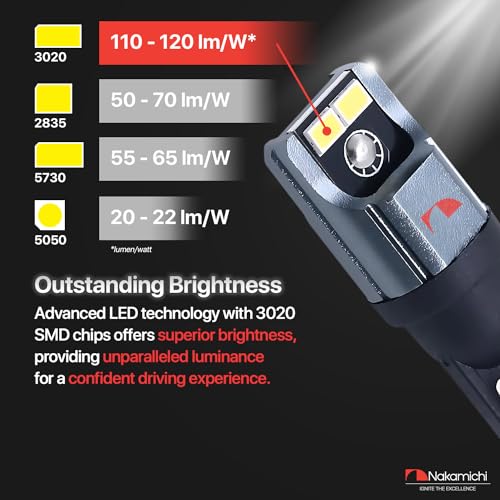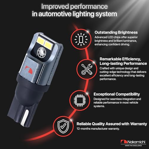 ? Nakamichi Corporation Ltd. founded in 1948 by Mr. Etsuro Nakamichi, is a Japanese consumer electronics brand that originated in Japan and gained popularity from 1970s onwards from producing high quality audio cassette decks to design-oriented home cinema audio systems, speakers, hi-fi systems, automotive stereo products and now extending their commitment to excellence in automative interior & exterior LED lighting. ? Achieve 200% more illumination than halogen: Experience a remarkable luminosity of up to 480 lumens and 0.32W per bulb with Nakamichi's enhanced T10 (W5W) LED bulbs. Sporting a 6,000K Xenon White colour temperature and boasting 4 high-performance SMD chips per bulb, they generate a brilliant vivid white light, dramatically enhancing your nighttime visibility. Allowing you to view objects clearer during nighttime journeys. Also, with instant start-up, they achieve full brightness without any delay and looks cool indeed. ? 50,000 Hours of lifespan with state-of-the-art cooling mechanism: With heavy duty cold forging heat sink, a complete aviation grade 6063 aluminium body and a hollow body design, the Nakamichi LED bulbs guarantee an uninterrupted lighting for over 50,000 hours. Each LED bulb and its components undergo rigorous testing to ensure long lasting performance. This exceptional built ensures reliable performance even on hot sunny days or in adverse weather conditions. ? 1:1 Beam pattern and 360-degree illumination for effective lighting: LED light bulb quality extends beyond mere brightness. It's about having the right construction and LED chips that closely emulate the characteristics and fitting of halogen bulbs. These led bulbs can be used for car interior lights, dome lights, map lights, vanity mirror lights or cargo area lights, license plate lights, side door courtesy lights, scuff plate lights and many more. Please check the original bulb size before making your purchase. ? 95% Vehicle compatibility: Enjoy a seamless experience with Nakamichi LED bulbs. There is no radio interference, no flickering and no error codes. Nakamichi intelligent CAN-bus controller, makes it compatible with 95% of vehicle systems. However, for certain sensitive vehicles, the use of a load resistors or flash relay may be necessary to ensure optimal performance. ? Effortless 10-minute installation: Featuring a nearly identical design resembling traditional halogen light bulbs and a non-polarity socket, our LED bulbs seamlessly fit into the light housing and factory socket without requiring any modifications. You can easily replace them in just minutes.