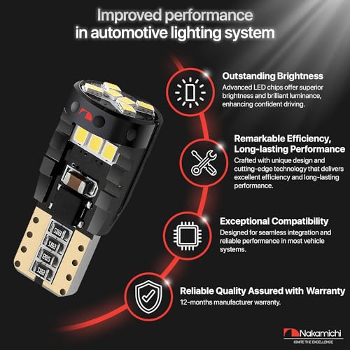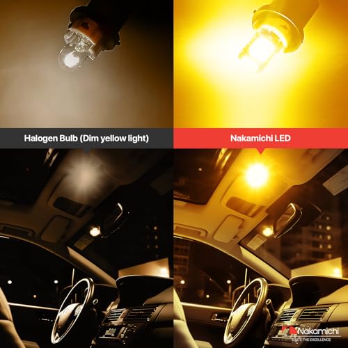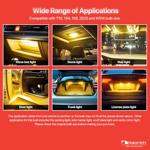 ? Nakamichi Corporation Ltd. founded in 1948 by Mr. Etsuro Nakamichi, is a Japanese consumer electronics brand that originated in Japan and gained popularity from 1970s onwards from producing high quality audio cassette decks to design-oriented home cinema audio systems, speakers, hi-fi systems, automotive stereo products and now extending their commitment to excellence in automative interior & exterior LED lighting. ? Achieve 200% more illumination than halogen: Experience a remarkable luminosity of up to 1,680 lumens and 2.4W per bulb with Nakamichi's enhanced T10 (W5W) LED bulbs. Sporting a 2,500K Giallo Amber colour temperature and boasting 12 high-performance SMD chips per bulb, they generate a brilliant vivid amber light, dramatically enhancing your nighttime visibility. Allowing you to view objects clearer during nighttime journeys. Also, with instant start-up, they achieve full brightness without any delay and looks cool indeed. ? 50,000 Hours of lifespan with state-of-the-art cooling mechanism: With heavy duty cold forging heat sink, a complete aviation grade 6063 aluminium body and a hollow body design, the Nakamichi LED bulbs guarantee an uninterrupted lighting for over 50,000 hours. Each LED bulb and its components undergo rigorous testing to ensure long lasting performance. This exceptional built ensures reliable performance even on hot sunny days or in adverse weather conditions. ? 1:1 Beam pattern and 360-degree illumination for effective lighting: LED light bulb quality extends beyond mere brightness. It's about having the right construction and LED chips that closely emulate the characteristics and fitting of halogen bulbs. These led bulbs can be used for car interior lights, dome lights, map lights, vanity mirror lights or cargo area lights, license plate lights, side door courtesy lights, scuff plate lights and many more. Please check the original bulb size before making your purchase. ? 95% Vehicle compatibility: Enjoy a seamless experience with Nakamichi LED bulbs. There is no radio interference, no flickering and no error codes. Nakamichi intelligent CAN-bus controller, makes it compatible with 95% of vehicle systems. However, for certain sensitive vehicles, the use of a load resistors or flash relay may be necessary to ensure optimal performance. ? Effortless 10-minute installation: Featuring a nearly identical design resembling traditional halogen light bulbs and a non-polarity socket, our LED bulbs seamlessly fit into the light housing and factory socket without requiring any modifications. You can easily replace them in just minutes.
