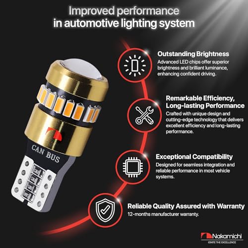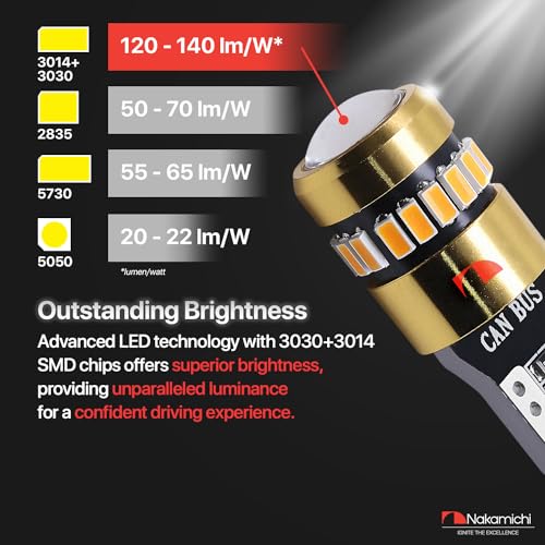 ? Nakamichi Corporation Ltd. founded in 1948 by Mr. Etsuro Nakamichi, is a Japanese consumer electronics brand that originated in Japan and gained popularity from 1970s onwards from producing high quality audio cassette decks to design-oriented home cinema audio systems, speakers, hi-fi systems, automotive stereo products and now extending their commitment to excellence in automative interior & exterior LED lighting. ? Achieve 200% more illumination than halogen: Experience a remarkable luminosity of up to 2,660 lumens and 5.32W per bulb with Nakamichi's enhanced T10 (W5W) LED bulbs. Sporting a 6000K Xenon White colour temperature and boasting 19 high-performance SMD chips per bulb, they generate a brilliant vivid white light, dramatically enhancing your nighttime visibility. Allowing you to view objects clearer during nighttime journeys. Also, with instant start-up, they achieve full brightness without any delay and looks cool indeed. ? 50,000 Hours of lifespan with state-of-the-art cooling mechanism: With heavy duty cold forging heat sink, a complete aviation grade 6063 aluminium body and a hollow body design, the Nakamichi LED bulbs guarantee an uninterrupted lighting for over 50,000 hours. Each LED bulb and its components undergo rigorous testing to ensure long lasting performance. This exceptional built ensures reliable performance even on hot sunny days or in adverse weather conditions. ? 1:1 Beam pattern and 360-degree illumination for effective lighting: LED light bulb quality extends beyond mere brightness. It's about having the right construction and LED chips that closely emulate the characteristics and fitting of halogen bulbs. These led bulbs can be used for car interior lights, dome lights, map lights, vanity mirror lights or cargo area lights, license plate lights, side door courtesy lights, scuff plate lights and many more. Please check the original bulb size before making your purchase. ? 95% Vehicle compatibility: Enjoy a seamless experience with Nakamichi LED bulbs. There is no radio interference, no flickering and no error codes. Nakamichi intelligent CAN-bus controller, makes it compatible with 95% of vehicle systems. However, for certain sensitive vehicles, the use of a load resistors or flash relay may be necessary to ensure optimal performance.