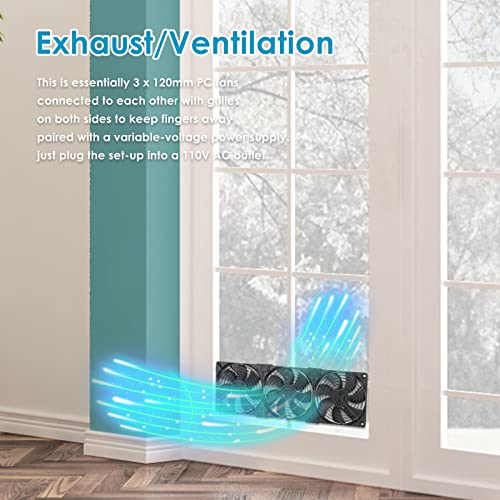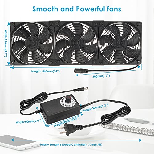 ?High CFM Computer fan 360mm? They're 3 x 120mm fans put together and hold with metal brackets between each individual fan. It comes with a speed control which is handy. The unit features a potentiometer (rotary knob) to allow you to adjust the fan speed that allows you to choose the best balance between airflow needs and noise needs. ?Fan Parameters?Dimensions: 360x120x25mm (14x4.7x1in) | Speed:3000RPM x3 | Airflow:95CFM x3 | Current: 1.2A at full speed | Power: 13W | Interface: 5.5*2.1mm female plug ?Dual Ball Bearing?Long life with 6 years. It overcomes the problems of short life and unstable operation of oil bearing. good price and works great ?Variable Speed Controller?Range of control in fan speed is 3v to 12v | INPUT: AC 100V - 240V 50/60Hz | Rated Current: 2.0A | Speed control great for fine tuning, Completely adjustable from off to full blast. enables the fan to be powered through an AC outlet. ?Good DIY Cooling Solution?It works great for DIY cooling fan or as an additional cooling fan for receivers, cabinet , chassis, server workstation, PC case, greenhouse, mushroom growing, plant cabinet, Crawl space, Basement, Laundry room, Garage, Attic, RV refrigerator, X-box, ps4, Amplifier, kitchen window, server, humidifier, mushroom growing, sound system, etc. ?Warranty & Packing List?Warranty: One-year quality assurance. Please contact Seller If the product has any quality problems, it will be refunded within 90 days and replaced within one year | Packing list: 1 pack 360mm fan with protective grills on both sides and a separate speed controller.