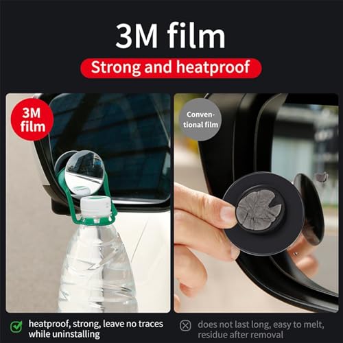 MAXIMIZE WIDE ANGLE VIEW Convex mirror with flexible 360 degree adjustable angle and 30 degree adjustable sway designed to maximize viewing area and encourage safer driving Includes tiny adjustable swivel mounting bracket Perfect for passing or changing lanes HIGHLY DURABLE ULTRA SLIM DESIGN High definition frameless glass mirror is waterproof rust resistance and features anti-spatter design Strong waterproof 3M adhesive tape is designed for long-term use. FAST INSTALLATION Easily install within seconds no tools required Sleek design allows for fitting on any mirror type and any orientation Choose from fixed or adjustable angle mounting For use on all vehicle types except motorcycles IMPORTANT To ensure proper installation clean the vehicle side mirror thoroughly with alcohol or some other cleaning product prior to firmly pressing the 3M adhesive tape and mounting bracket to the side mirror