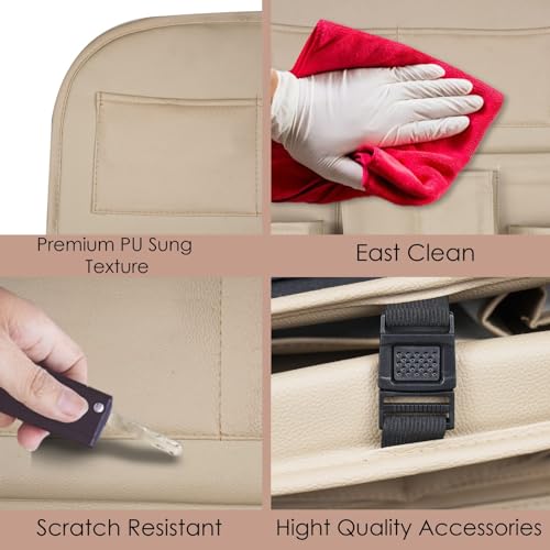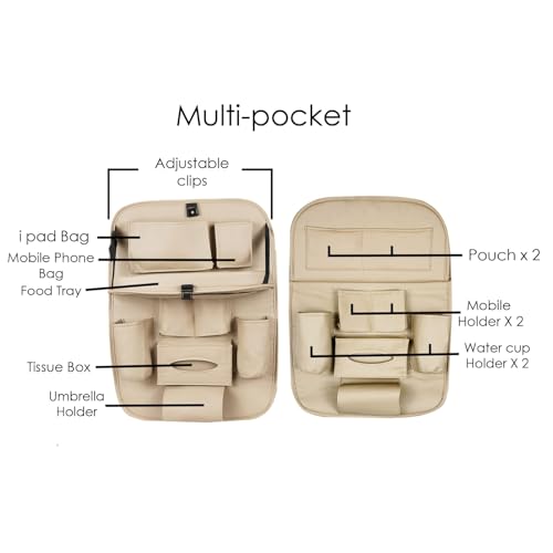 MULTIFUNCTIONAL SEAT ORGANIZER: A must-have accessory for travelling, this heavy-duty car seat organizer is a great storage pack to store your phone, tablet, water bottle, umbrella and tissue box in a organised manner while also offering you a comfortable option for dining during long and exhausting trips with its foldable table tray. ADJUSTABLE ORGANIZER WITH UNIQUE FOLDABLE TRAY: This car backseat organizer is having a buckled strap along with various attach points to ensure perfect fit to any vehicle such as car, SUVs and van. Besides, our offered car back seat organizer has a unique foldable tray which is made by board that can bear up to 2 kg of weight. MAX CAPACITY CAR BACK SEAT STORAGE: This car backseat organizer has multiple pockets for different must-have items for any car trip. It has distinct pockets to carry different items in their place securely like documents, maps, pens, snacks, notebooks, smart phones, tissues, umbrella and water bottles. Everything will be close to hand. BACK SEAT PROTECTOR WITH COMFORT: Best part about having this car back seat organizer is its waterproof feature and anti-slip backing. It will protect your car?s backseat against damage from scuff marks, stains and mud. Its long enough adjustable straps remain tucked under the seat?s back and do not create problem to driver or passenger. EASY TO CLEAN & INSTALL: Made using stain-resistant PU leather which is waterproof too, it is quite easy to clean. You just need to wipe it with a wet cloth. Also, it?s simple and easy to install. It takes less than a minute for fixing with the long adjustable straps.