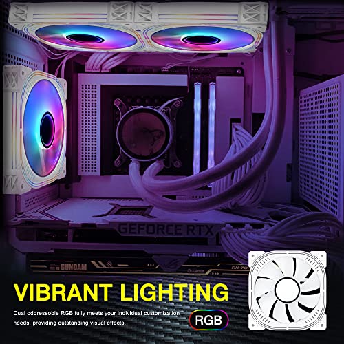 [High Performance Cooling Fans] - Size: 120*120*25mm, Speed: 1200RPM±10%, Noise ? 25dBA, Current: 0.20A, Static Pressure: 0.9mm H2O, Air Flow: 36 CFM. [Unique Light Effect] - With high bright RGB LED lights, white fan blade can effectively reflect the light, making the case fans lighting effect softer, bring bright and clean visual experience for you, add fun and bring you better gaming experience. [Super Quiet Fan] - That cools your system in silence A mix of perfectly crafted 9-blade fan design and sound absorbing rubber pads that cools your system in silence. Peace and quiet even when your PC is working overtime. [Long Service Life] - Hydraulic bearing self-lubricates with a friction-reducing substance, keeping fan noise to a minimum while providing maximum cooling performance when needed and extending the life of the computer fan. [Simple Installation] - This computer case fans is compatible with all types of chassis and easy to install. Humanized power supply interface design, two interfaces of small 3PIN on the motherboard and 4PIN for power supply D-type Port.