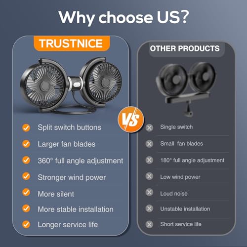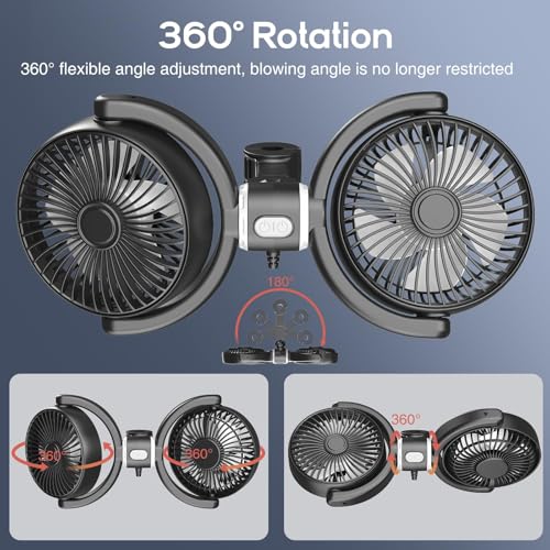 HEADREST-MOUNTED USB TWIN FAN: This USB car fan features a twin-fan configuration that securely mounts to your car's headrest posts, offering optimal air circulation for both the front and back seats. Its compact, clip-on design saves cabin space while delivering maximum cooling comfort during your drive. THREE SPEED SETTINGS FOR CUSTOMIZED COOLING: Tailor your comfort with the convenient button control that offers three distinct fan speed options. Effortlessly switch between low, medium, and high settings to match your cooling needs, whether you want a gentle breeze or powerful air flow during your ride. ADJUSTABLE ANGLE DESIGN: Enjoy a refreshing breeze from any position in your vehicle thanks to the adjustable angle feature. The fan heads can be easily tilted and rotated, allowing both drivers and passengers to direct airflow exactly where its needed, providing a comfortable environment on hot days. USB PLUG & GO SIMPLICITY: With its universal USB power connection, this car fan is incredibly easy to set upsimply plug it into your cars USB port or a power bank and enjoy instant cooling. The plug-and-play design ensures hassle-free operation, compatibility, and portability wherever you travel. STURDY AND SPACE-SAVING CONSTRUCTION: Engineered for durability, the fans robust build ensures long-lasting use even in demanding road conditions. Its streamlined, headrest-mounted form efficiently utilizes car space, preventing clutter while providing effective air circulation that enhances your overall in-car experience.