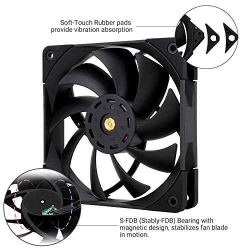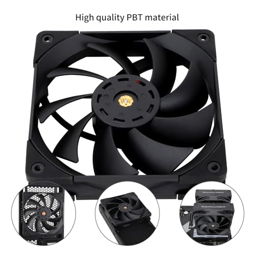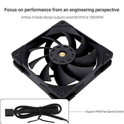 ?High Performance Cooling Fan? Automatic speed control of the motherboard through the 4PIN PWM fan cable interface, which can determine the speed according to the temperature of the motherboard, with a maximum speed of 1850RPM. ?High-quality bearing? The well-designed superior liquid bearing can keep the noise of the fan at the lowest level, and provide the maximum cooling performance when needed, as well as extend the service life of fan. ?Process upgrading?The pc fan blade is formed, initially corrected, and then corrected again by a laser balancing machine with 2 dots of mud glue to address possible imbalances in the rotation of the fan. The red mud glue in the middle of the fan is used to upgrade dynamic balance of fan and make its performance better (referred to as the two-dimensional dynamic balance). ?Dimensions of Case Fan? Size: 120*120*25mm, Speed: 1850RPM±10%, Noise ?29.6dBA Connector: 4pin pwm, Current: 0.25A, Air Pressure: 2.1mm H2O (MAX), Air Flow: 82CFM, Higher air flow for improved cooling performance. ?Perfect Match?The fan can be used not only as a case fan, but is also suitable for use with a cpu cooler to create a cooling effect together, which can take away the dry heat from the case and the high temperature generated by the CPU in operation, allowing for maximum cooling; Ideal for cases, radiators and CPU coolers.
