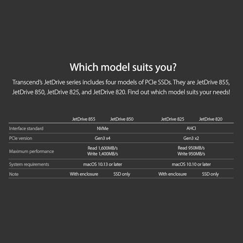 JetDrive 825 - Transcend's JetDrive 825 Thunderbolt PCIe portable SSD combines a JetDrive 820 PCIe SSD with a sleek aluminum Thunderbolt enclosure to instantly revitalize your Thunderbolt-equipped MacBook Pro, MacBook Air, Mac mini, or Mac Pro! Which model suits you? - Transcend's JetDrive series includes four models of PCIe SSDs. They are JetDrive 855, JetDrive 850, JetDrive 825, and JetDrive 820. Find out which model suits your needs! Thunderbolt technology in a sleek case - Transcend's JetDrive 825 features a 10Gb/s Thunderbolt interface, capable of blazing-fast file transfers. The drive is housed in sleek, aluminum alloy enclosure which was designed to tastefully complement your Mac's simple, clean design. In addition, the inner SSD is removable for greater ease of use based on users’ preferences. Expand storage in a flash - Upgrading your Mac with a Transcend JetDrive 820 allows you to increase storage capacity to up to 960GB, ensuring you have plenty of space for your documents, photos, music, and videos. Feel the need for speed - Transcend's JetDrive 820 utilizes the PCIe Gen3 x2 interface paired with the latest 3D NAND flash, resulting in compelling performance of up to 950MB/s read and 950MB/s write*. Transcend's JetDrive 820 gives you fluid, real-time performance for professional tasks, video editing, and 3D graphics.