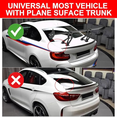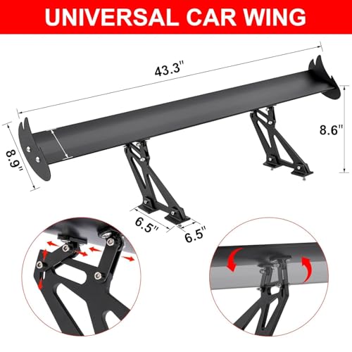 Wing Spoiler: Aluminum Wing Length(Maximum Distance): 110cm/43.3". Distance Between two brackets: 48cm/18.9". The spoilers for cars universally have adjustable angles. The Flame Exterior design gives your car a cool and unique look Aerodynamic Characteristics: This upgraded rear spoiler can help with the aerodynamics of a car by lowering drag. The exterior is designed in the shape of a flame helping put more downforce on the car, maximizing its contact with the ground for maximum traction and grip to increase stability Sporty & Stylish: Our racing spoiler has fully adjustable angles for customizable usages, efficiencies, and appearances, extra smooth lines give a cool racing look Lightweight & Sturdy: Our rear spoiler is constructed of Universal GT Type-V Matte Black Lightweight Aluminum for durability and extreme strength, allowing you to experience speed and passion while saving fuel High Performance: The GT wing spoiler with a single deck, can effectively reduce the impact of air resistance when driving at high speed, improve driving stability, and reduce fuel consumption. Easy to install and well-crafted design provide great driving experience at the same time