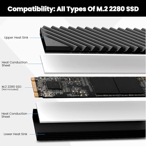 [Efficient Cooling] This NVME cooler features a fluted double-sided cooling design that increases the heat dissipation area to keep your M.2 2280 SSD running at optimal temperatures, preventing overheating and ensuring stable performance. [Easy Installation] This M.2 heatsink cooler does not require screws to be attached, and features a double-sided snap and slot design for quick and easy installation or removal on your device, simply snap the top and bottom clips together. [Durable Construction] This NVME heat sinks is made of all-aluminum to prevent corrosion and rust, and the 4-piece nano-silicone pads are soft and low-viscosity to be compatible with uneven M.2 SSD surfaces without damaging the M.2 SSD. [Improved Performance] The 45° tilted airflow structure of the NVME heat sinks fits better into the chassis air ducts, removes heat from the SSD faster, prolongs its lifespan, and improves overall system performance during intense gaming or heavy workloads. [Universal Compatibility] The M.2 2280 SSD heatsinks is compatible with M.2 PCIe 4.0 SSDs, PCIe 3.0 SSDs, and PS M.2 SSDs in both single and dual sided types. Compatible with WD Black SN850, Samsung 980 Pro/970 Pro, Sabrent Rocket 4/4 Plus, Silicon Power US70 and other SSDs.