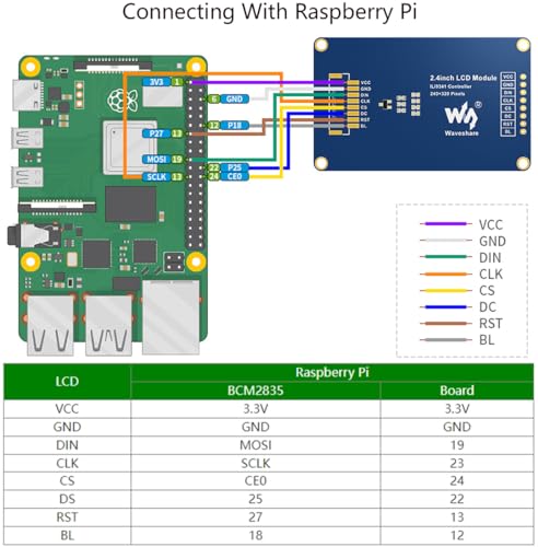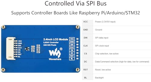 This is Waveshare 2.4inch LCD Display Module, 240×320 resolution, 65K RGB colors, clear and colorful displaying effect Embedded ILI9341 driver, using SPI bus SPI interface, minimizes required IO pins, compatible with Raspberry Pi/with Arduino/STM32, etc. TFT Display Panel; 3.3V/5V Operating Voltage; 4-wire SPI Communication Interface As a 2.4inch TFT display module with a resolution of 240 * 320, it uses the SPI interface for communication. LCD has an internal controller with basic functions, which can be used to draw points, lines, circles, and rectangles, and can display English, Chinese as well as pictures
