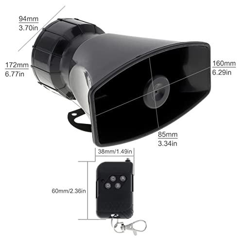 ? 7 SIREN SOUNDS: The car siren speaker can offer 7 loud and clear sounds, includes hooter, fire alarm, ambulance, traffic, police, etc. Please don’t use siren when emergency situation happened. ? WIRELESS REMOTE CONTROLLER: Easy to operate, control the horn with the button. Button A: Tone 1?Button B: Tone 2, press to stop the siren?Button C: Tone 3?Button D: 4 Different Tones, press to change tone. ? INSTRUCTIONS: Power siren with 12V or car battery. The supply voltage should meet the operating voltage and please make sure the cable connection is correct, or it will not work properly. ? LOUD AND CLEAR: The sound car siren is handy but loud and clear for its size. Please Not to be used as a replacement for professional equipment siren. ? PREMIUM QUALITY: The sound car siren is constructed from premium quality materials to ensure maximum strength and durability for long lasting usage