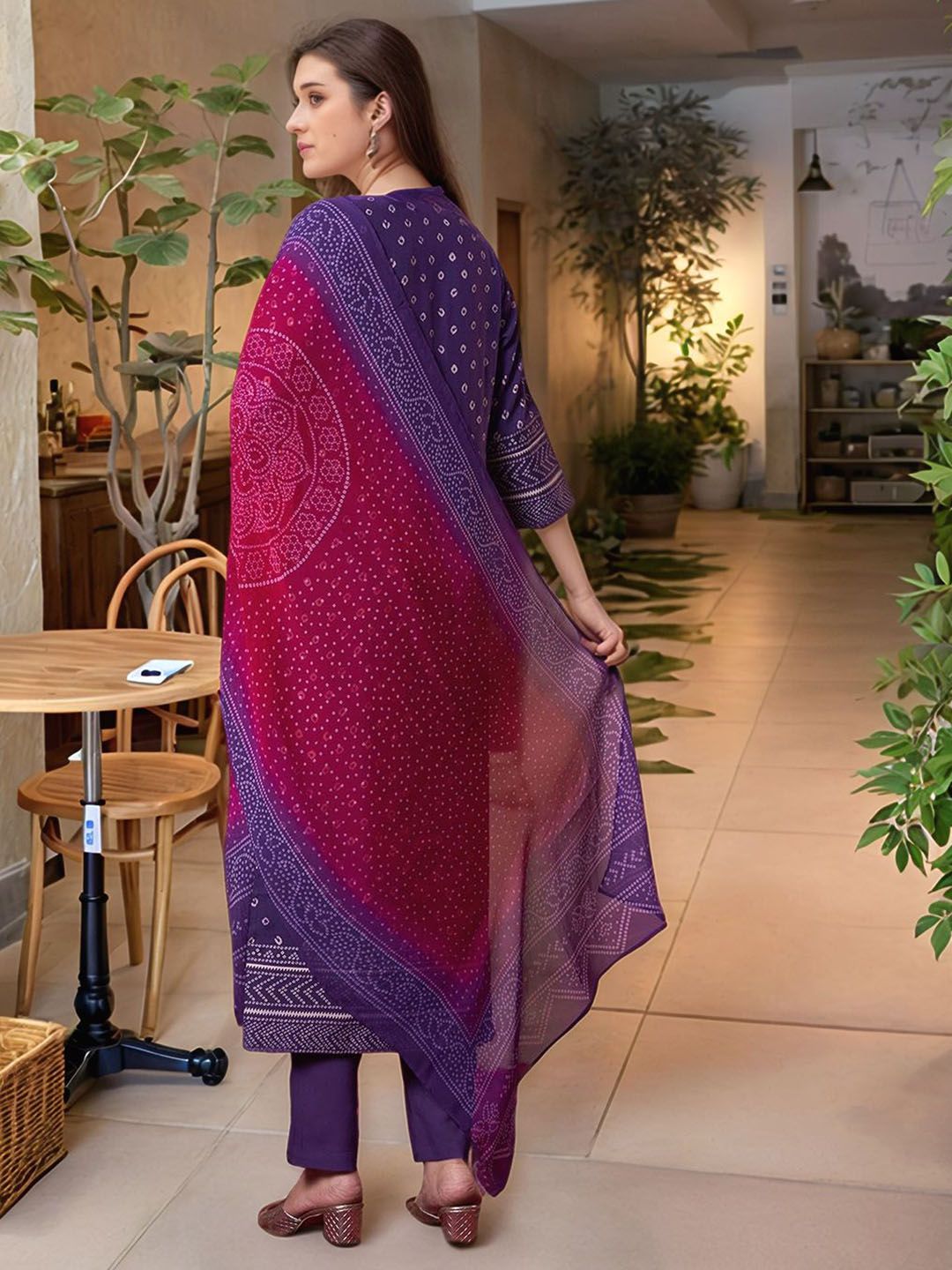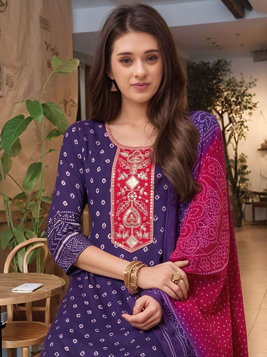 Aaghnya Bandhani Printed Thread Work Straight Kurta With Trousers & Dupatta