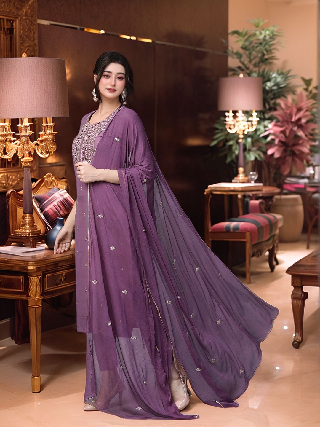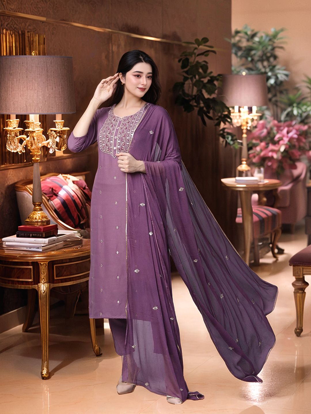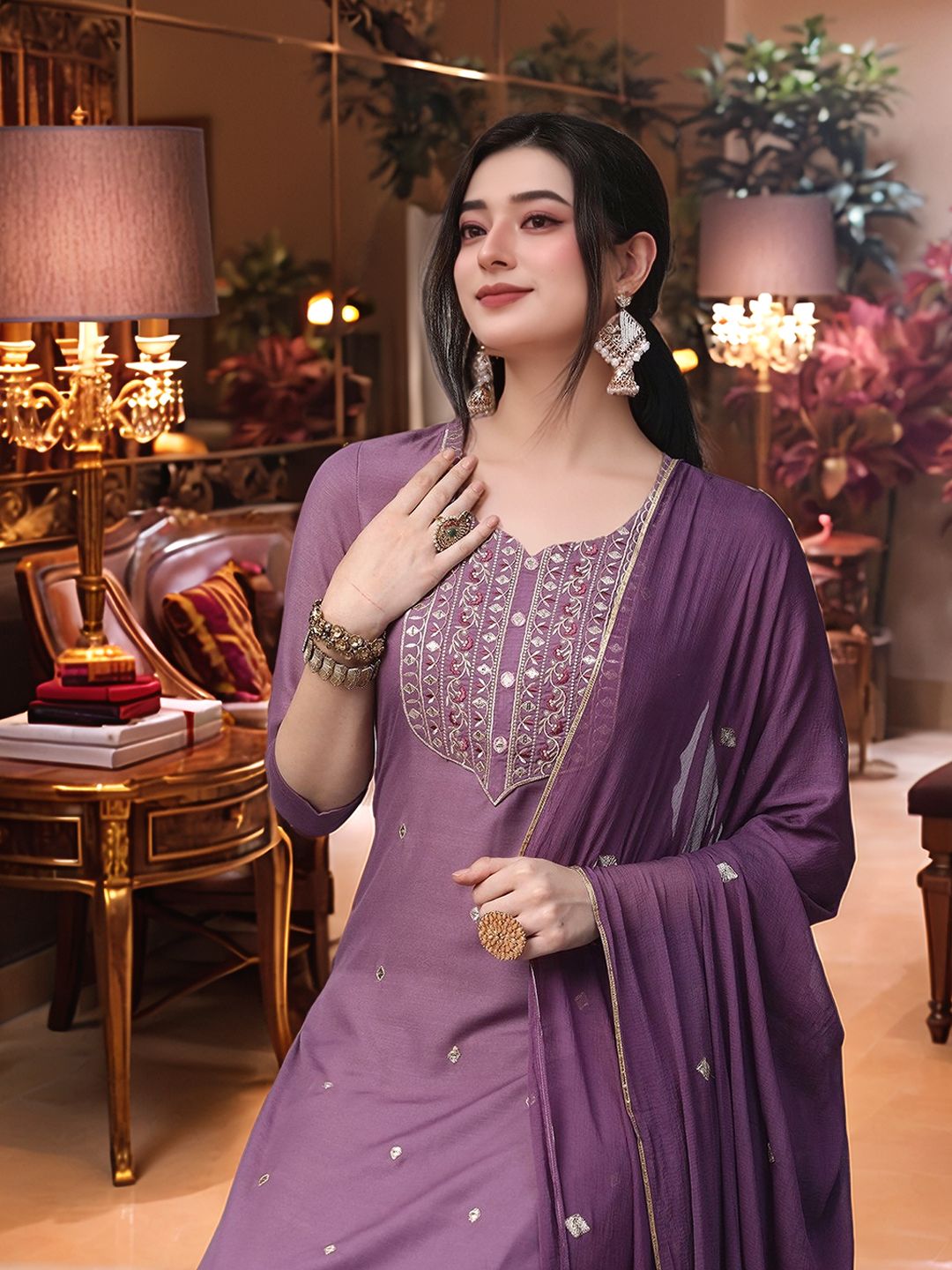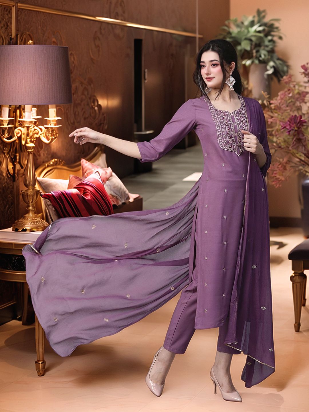 Aaghnya Floral Embroidered Notch Neck Kurta with Trousers & Dupatta