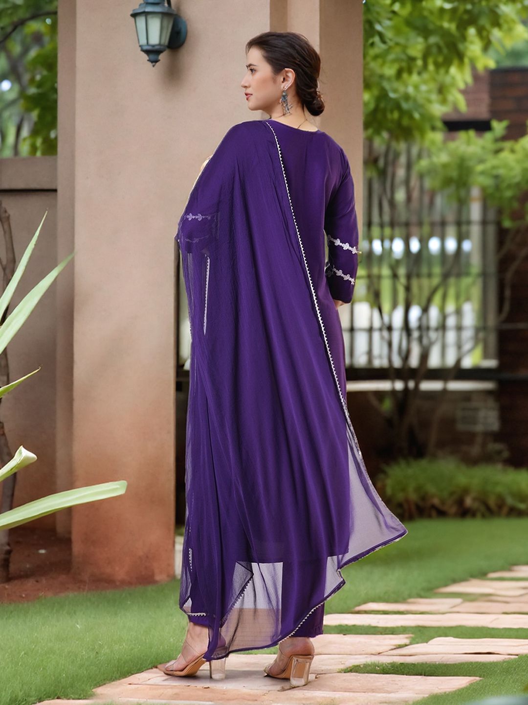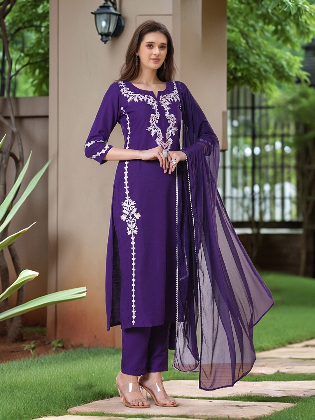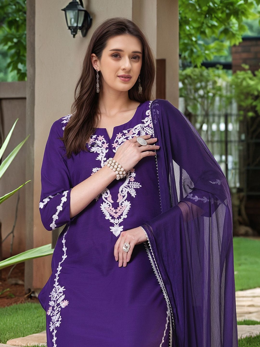 Aaghnya Floral Embroidered Notch Neck Panelled Thread Work Kurta With Trousers & Dupatta