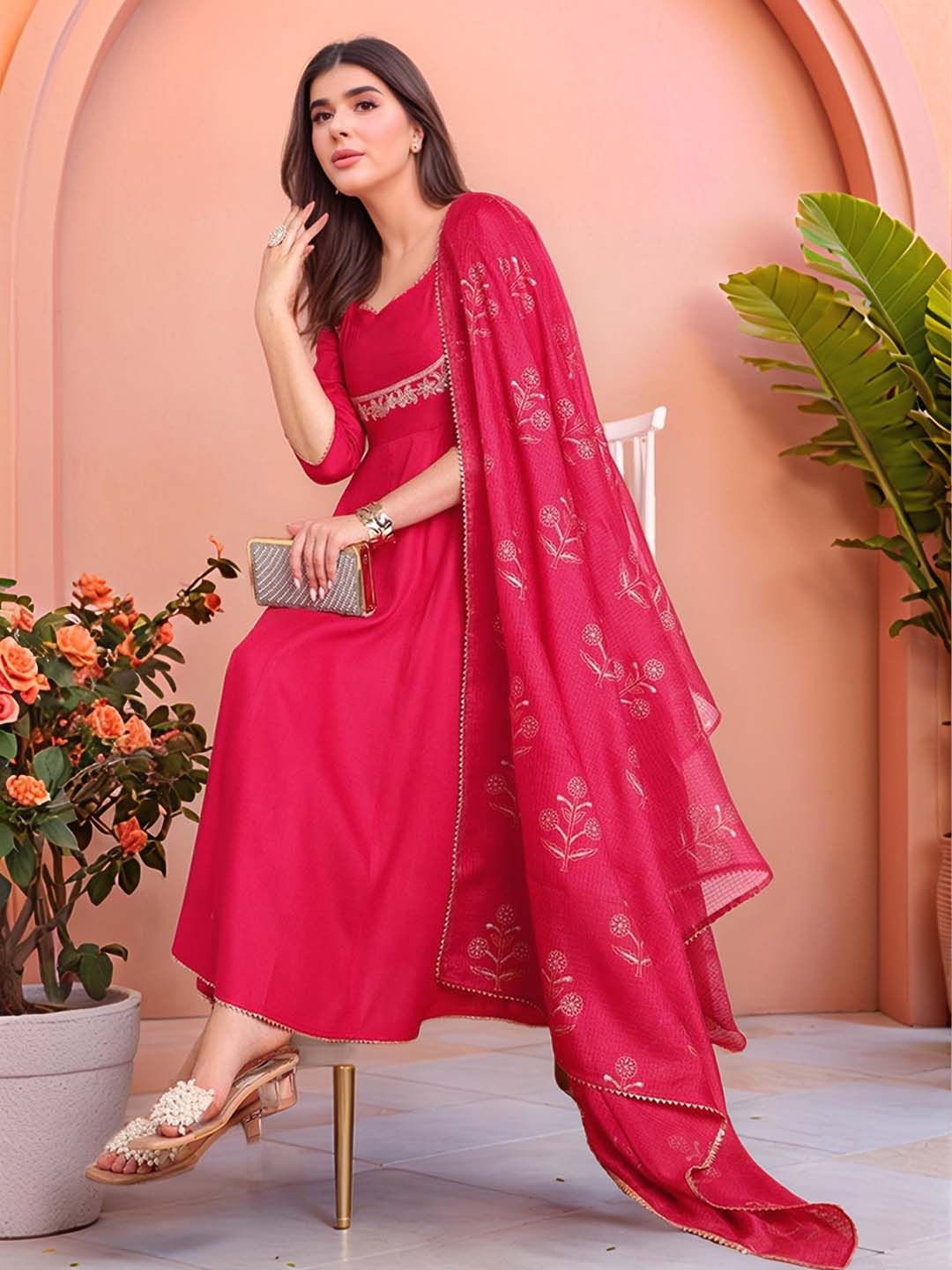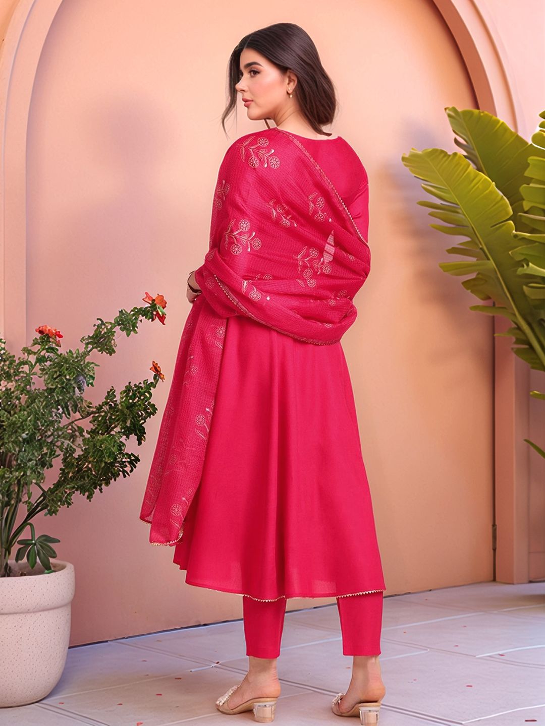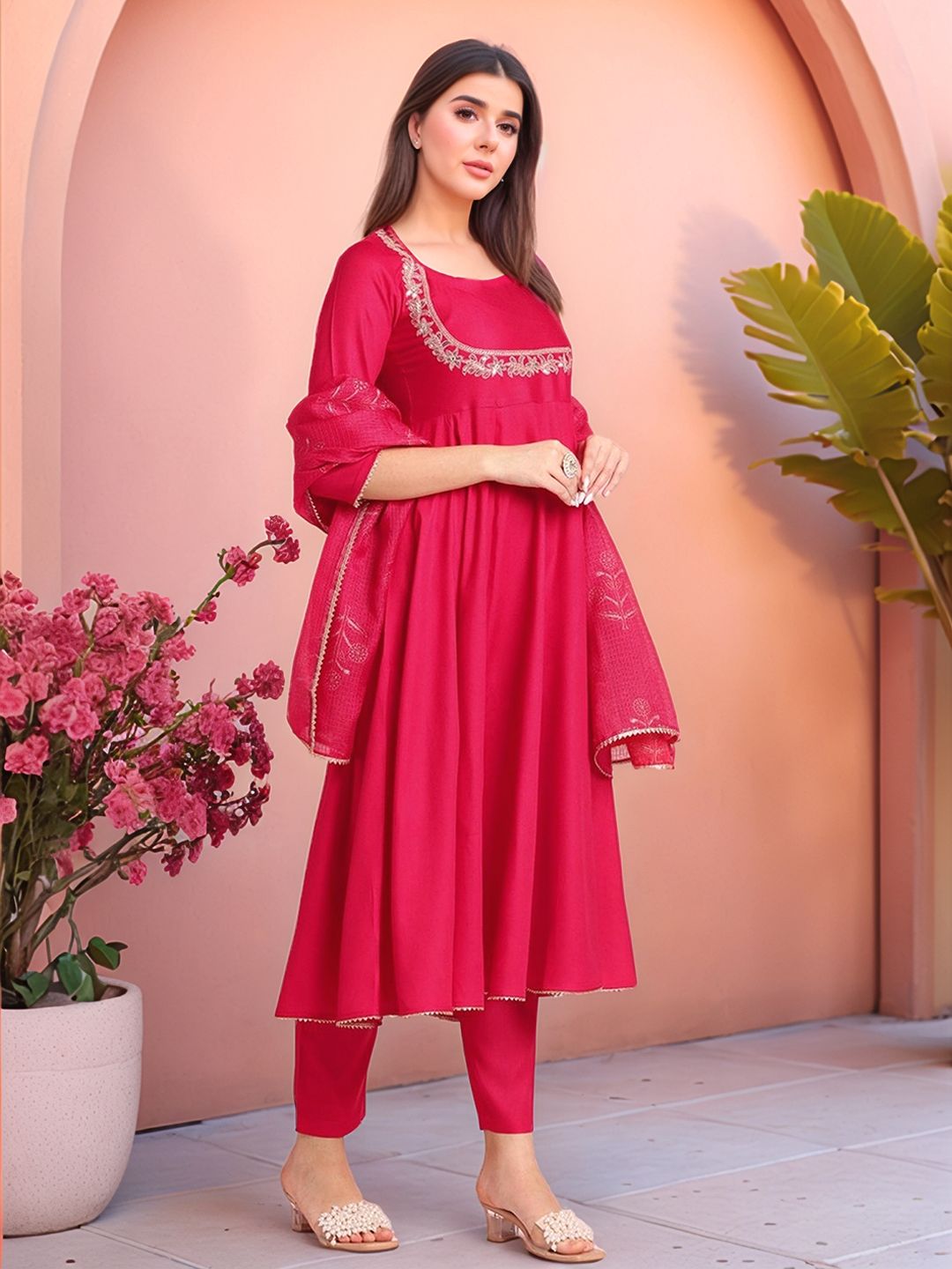 Aaghnya Floral Embroidered Round Neck Panelled Anarkali Kurta With Trousers & Dupatta
