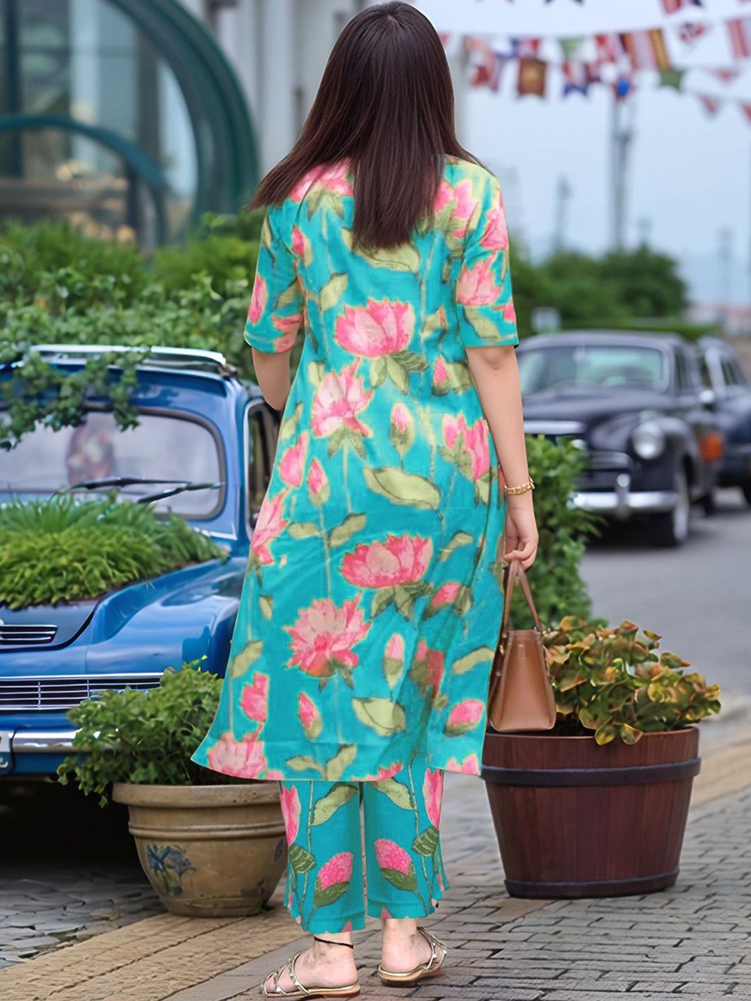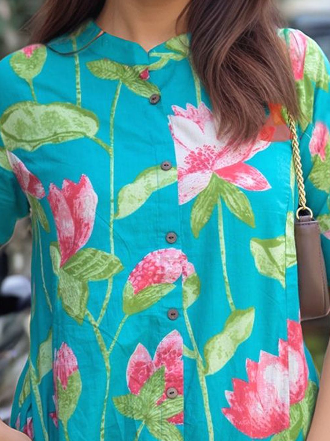 Aaghnya Floral Printed Mandarin Collar A-Line With Trousers